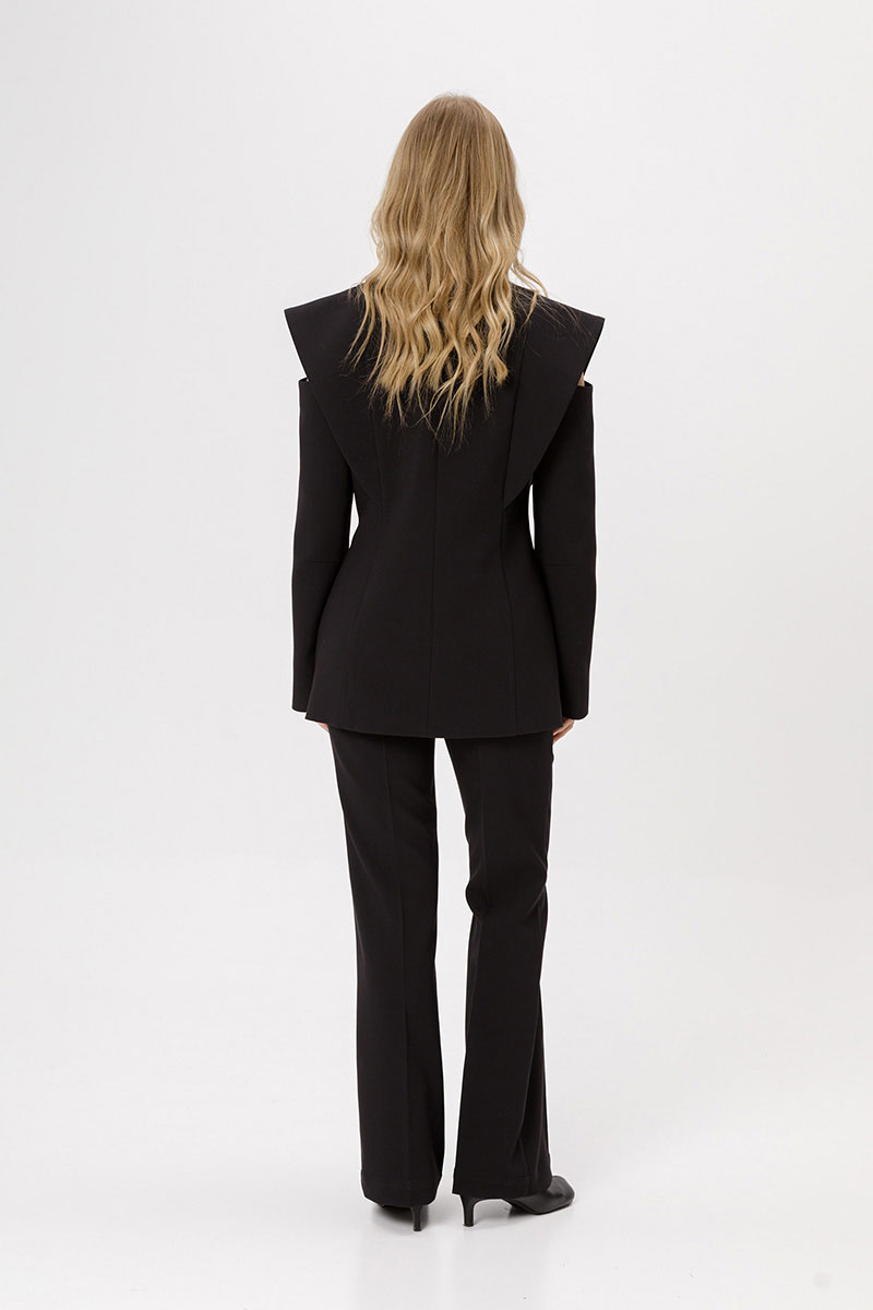 Детали: полуприлегающий силуэт, цельнокроеный воротник-стойка, двубортная застёжка на петли и пуговицы, рельефные швы переда и спинки с декоративным элементом, рукава длинные с вырезами по верху, функциональные карманы, жакет на подкладке.