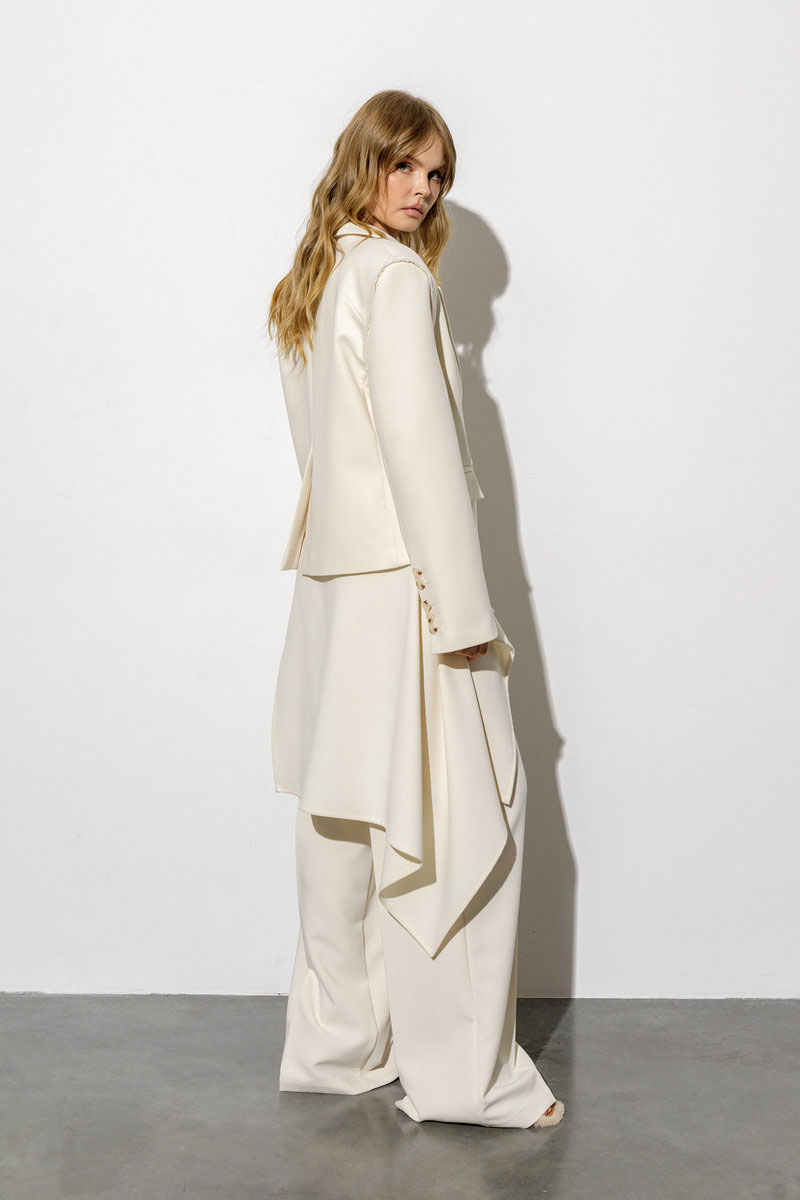 Детали: жакет прямого силуэта, пиджачный воротник, двубортная застежка на две петли и пуговицы, функциональные карманы, спинка с фигурной кокеткой, рукава втачные, жакет на подкладке. Брюки с притачным поясом со шлевками, складки у пояса, застежка на молнию и пуговицу, боковые карманы, заутюженные стрелки. Задние части брюк с вытачками и имитацией карманов.