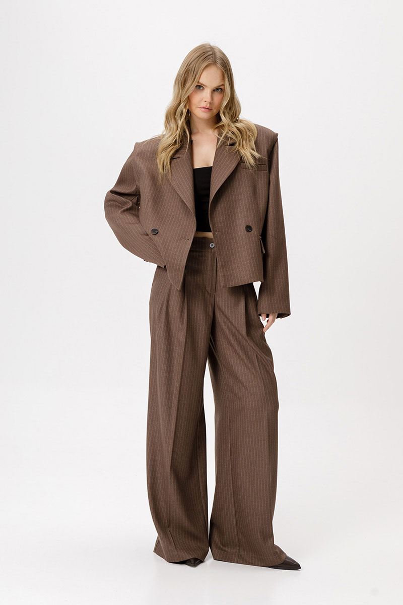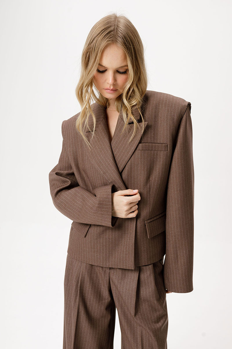 Детали: жакет прямого силуэта, пиджачный воротник, двубортная застежка на две петли и пуговицы, функциональные карманы, спинка с фигурной кокеткой, рукава втачные, жакет на подкладке.