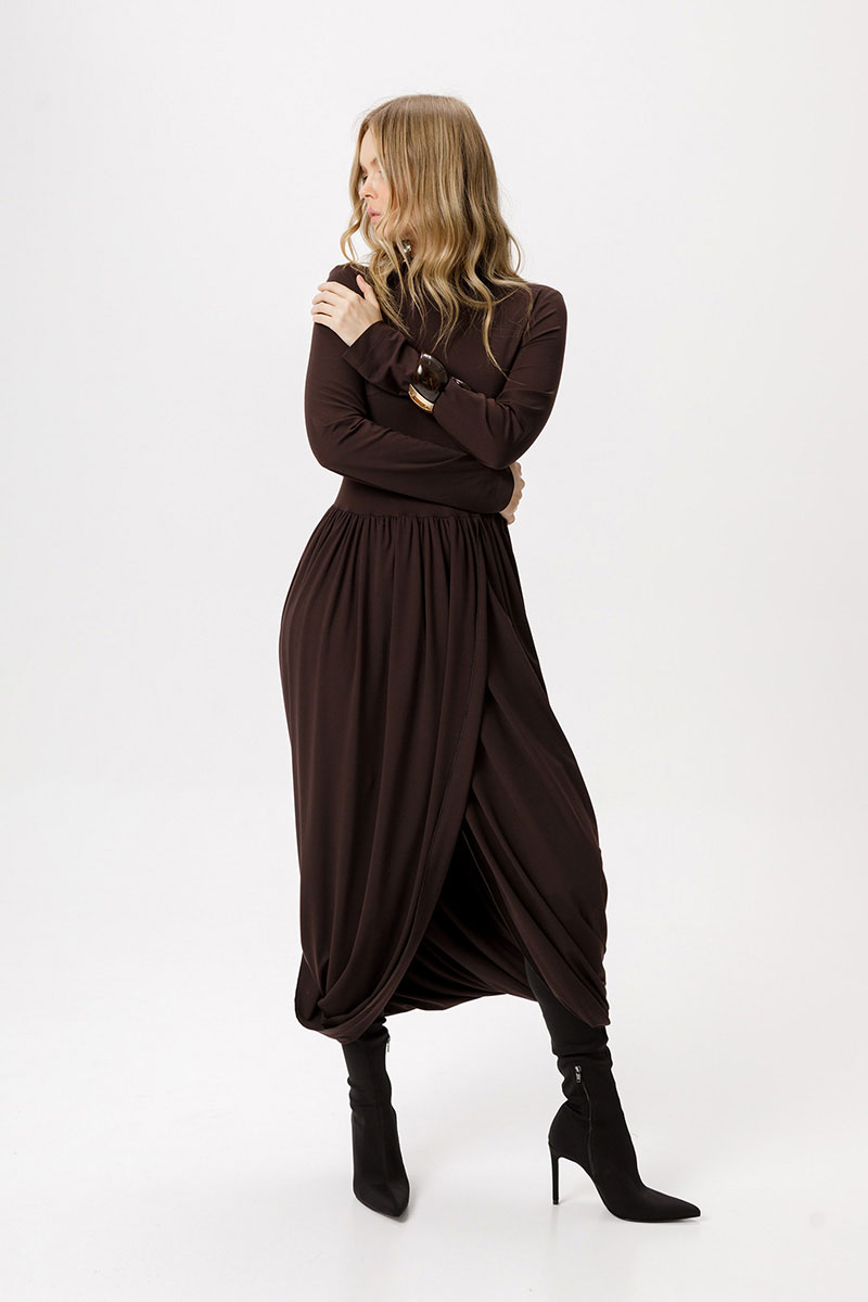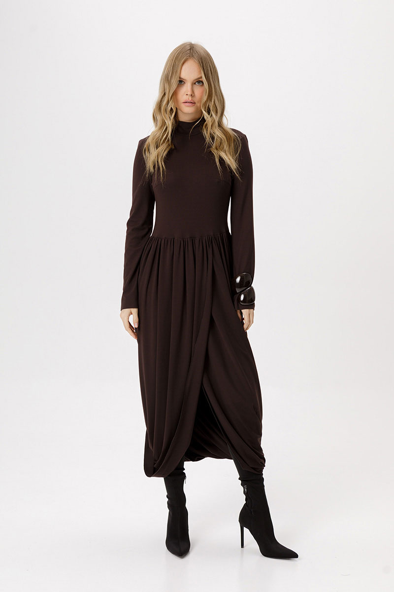 Детали: прилегающий силуэт, нагрудные вытачки, платье отрезное по талии, юбка со сборками на запах, втачной одношовный рукав, воротник-стойка.