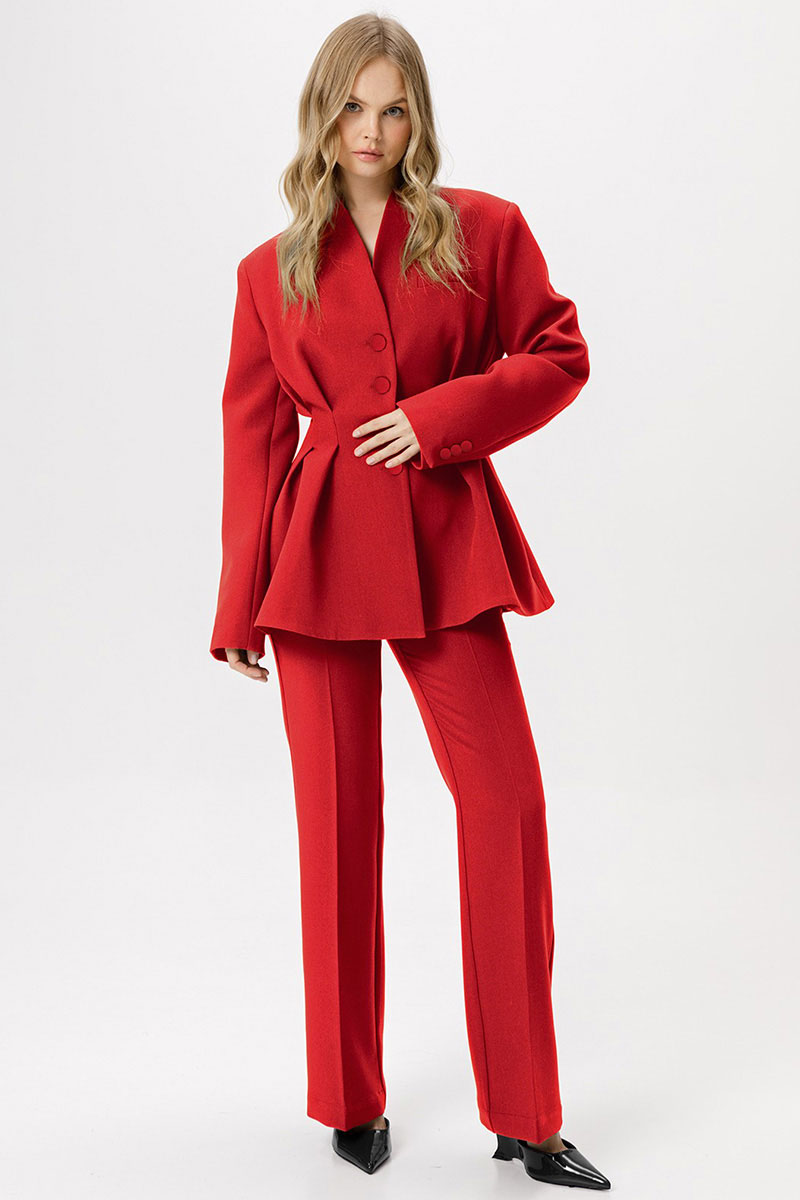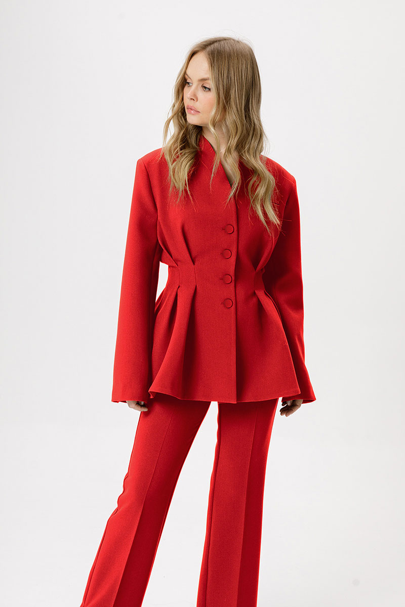 Костюм-двойка из приталенного жакета со складками и брюк-клеш со стрелками.