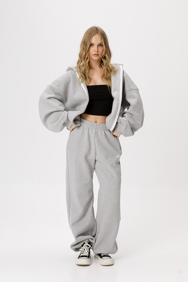 Спортивный костюм-двойка из оверсайз зип-худи и свободных брюк из трехнитки с начесом.