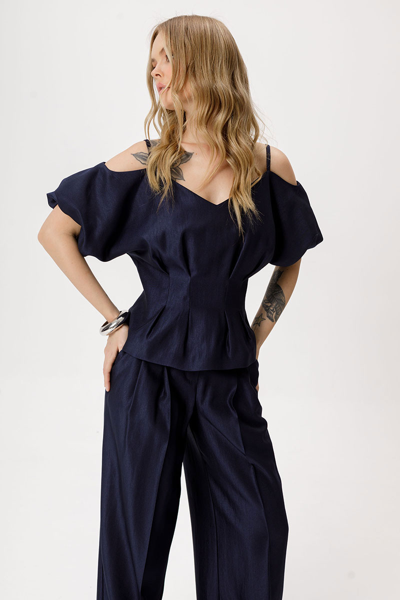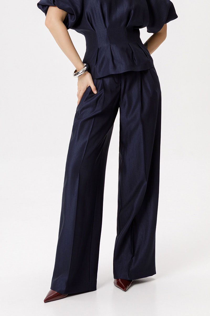 Детали: брюки с притачным поясом со шлевками, складки у пояса, застежка на молнию и пуговицу, боковые карманы, заутюженные стрелки. Задние части брюк с вытачками и имитацией карманов.