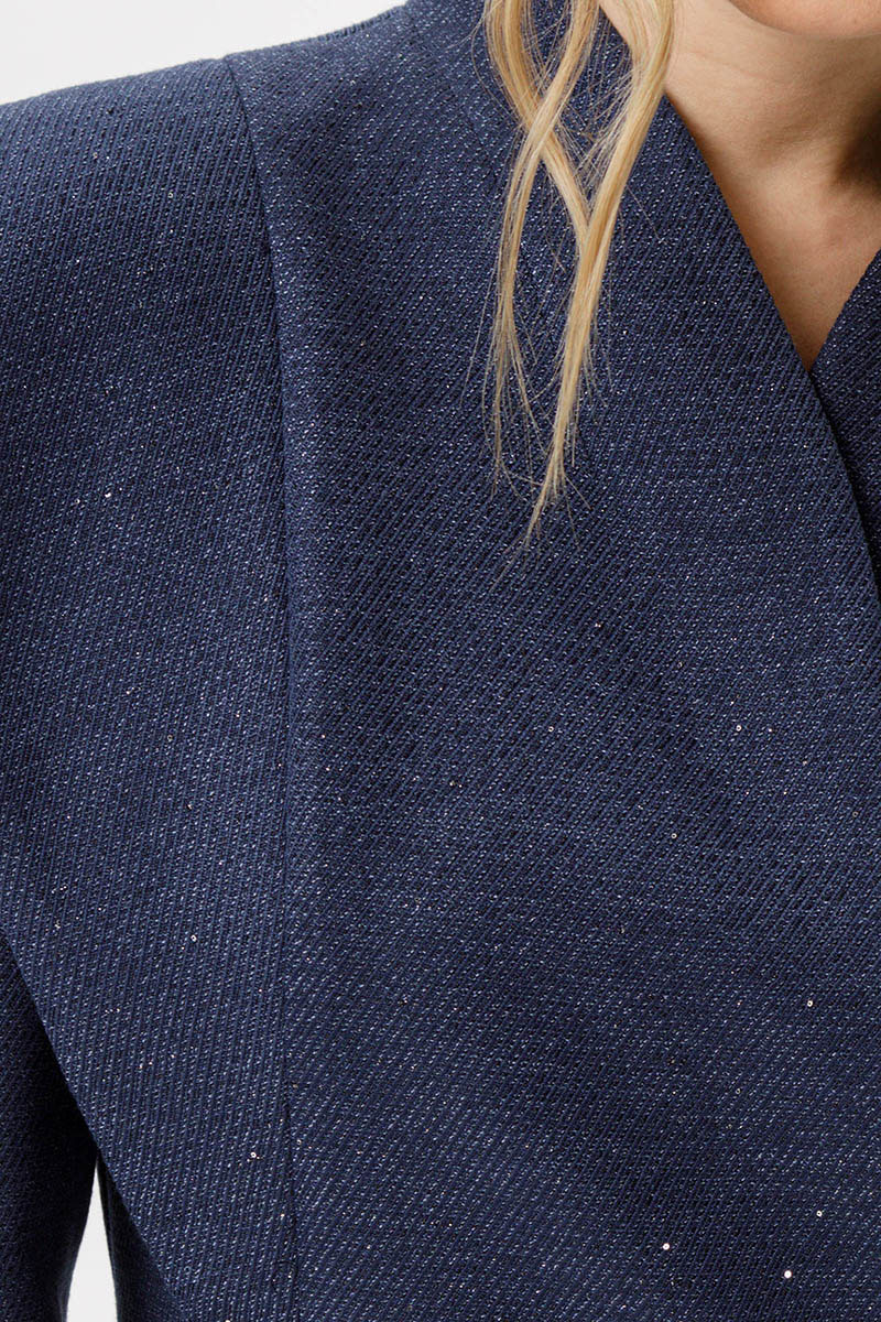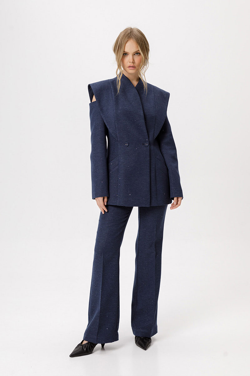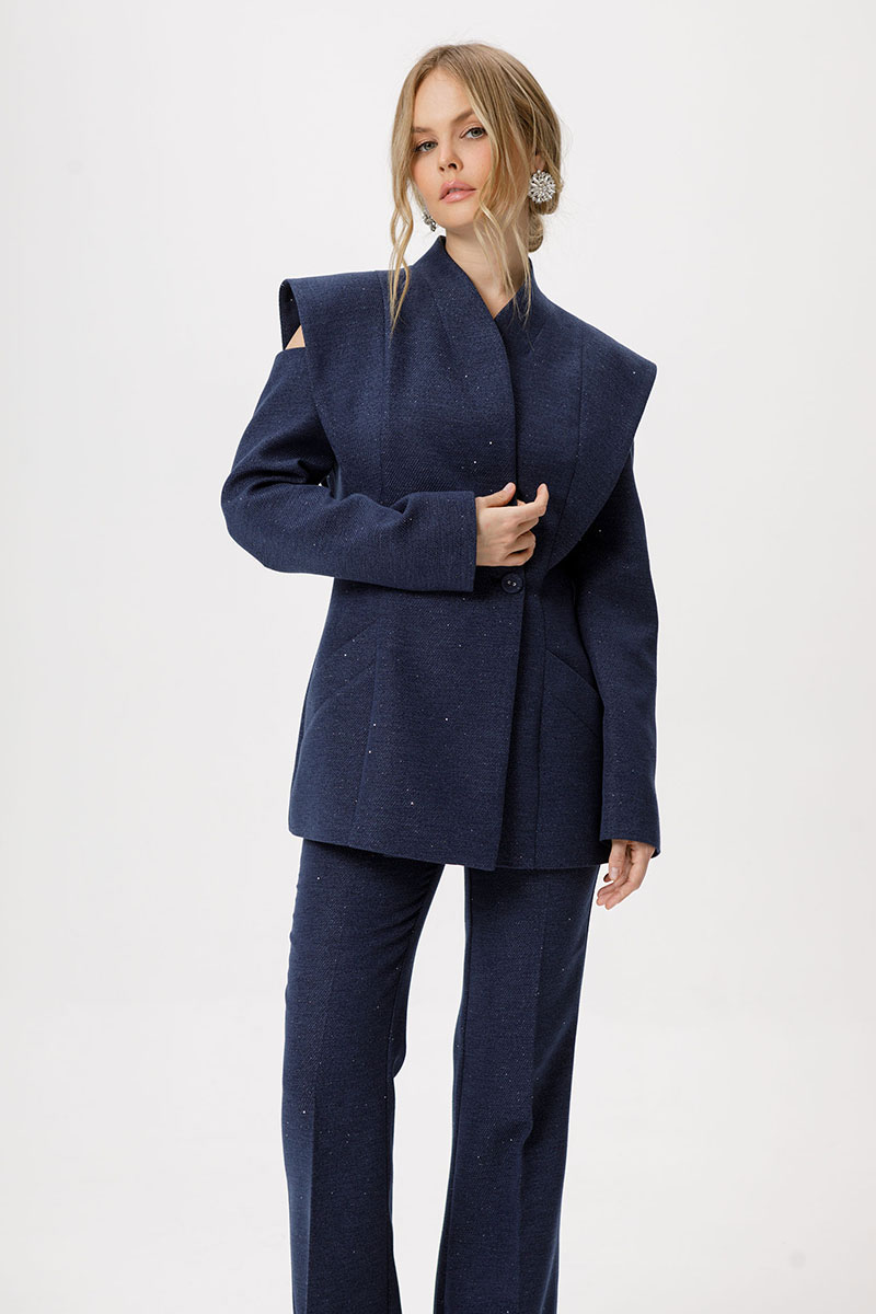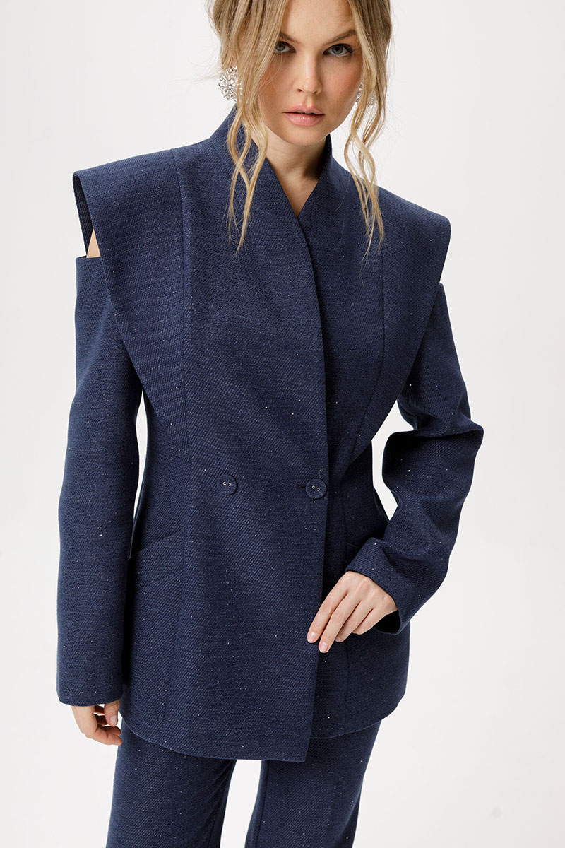 Детали: полуприлегающий силуэт, цельнокроеный воротник-стойка, двубортная застёжка на петли и пуговицы, рельефные швы переда и спинки с декоративным элементом, рукава длинные с вырезами по верху, функциональные карманы, жакет на подкладке.