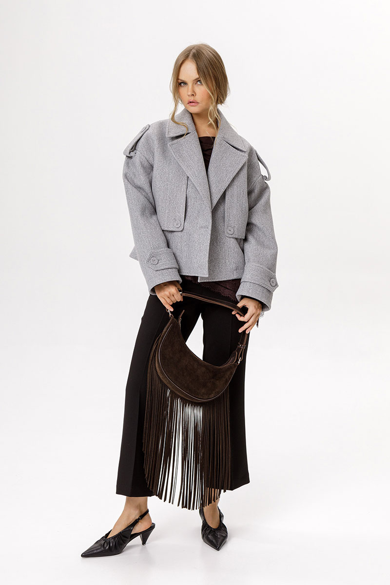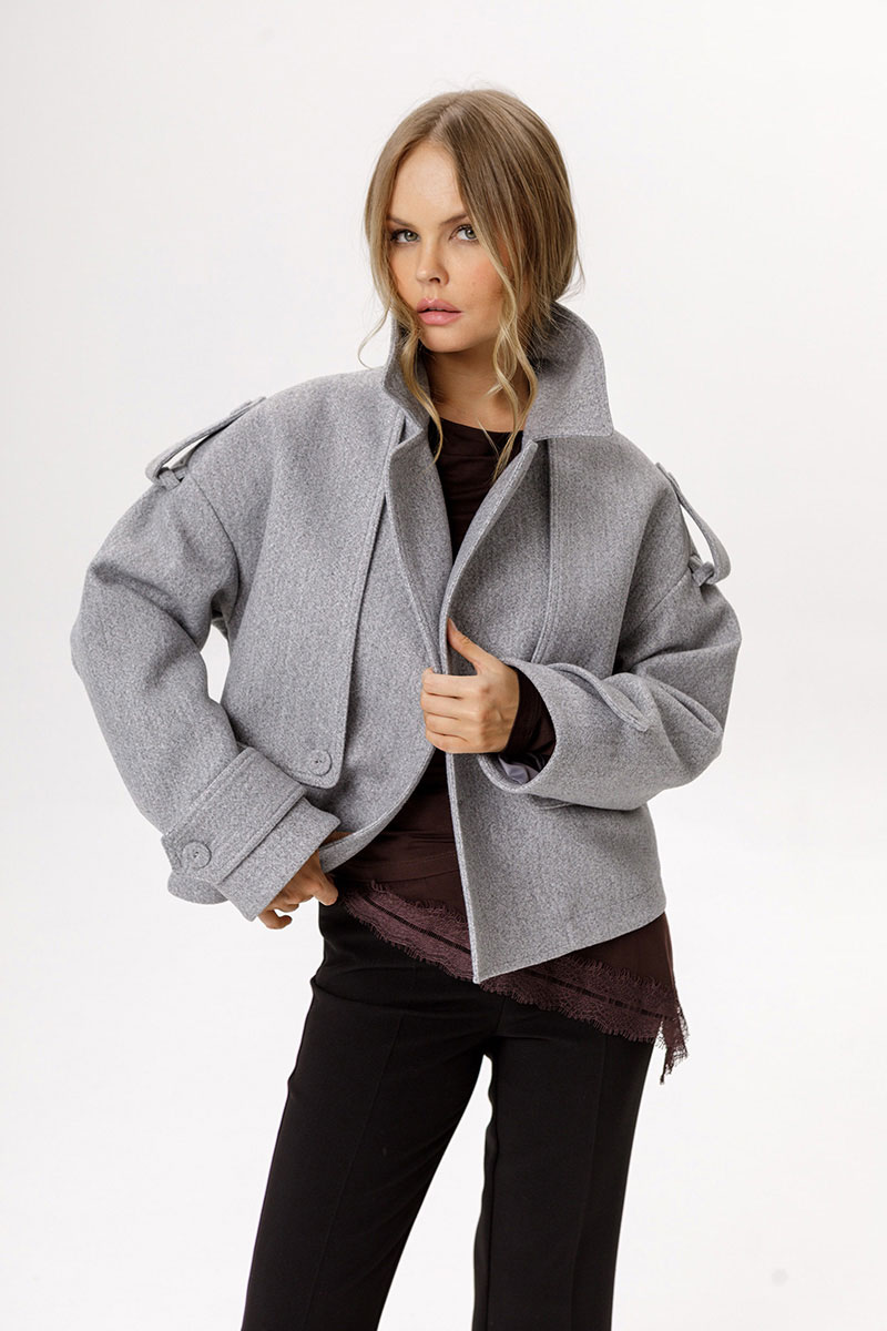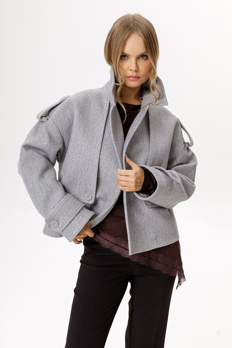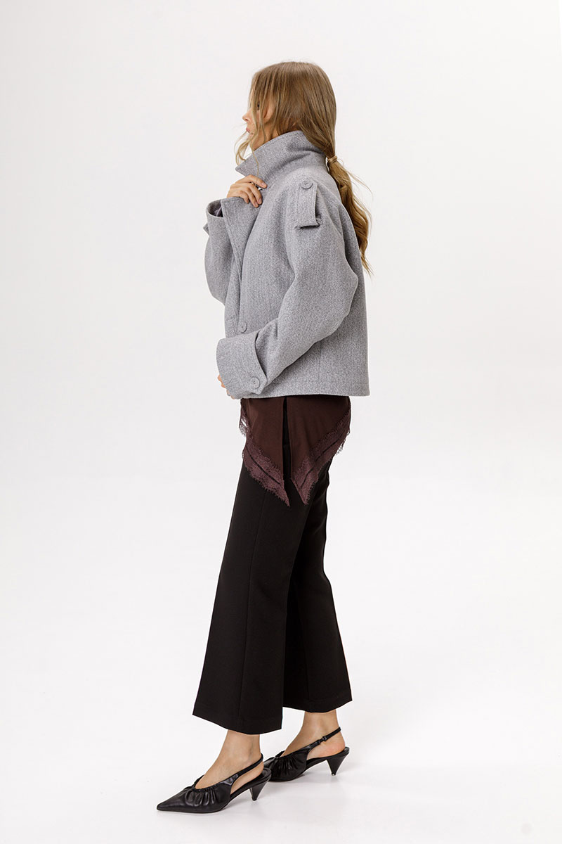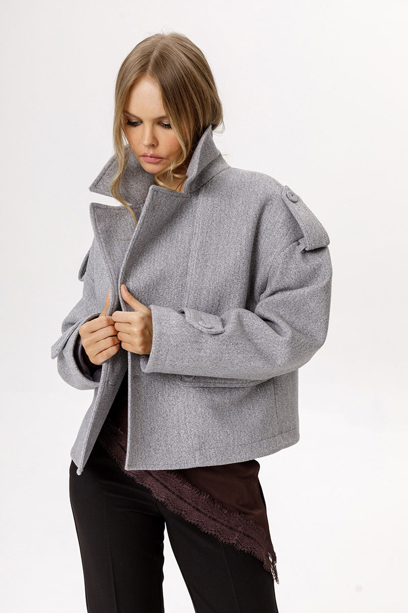 Детали: спущенная линия плеча, отлетные кокетки переда, застежка на петли и пуговицы, спинка со средним швом, длинные рукава с широкими патами, на подкладке.