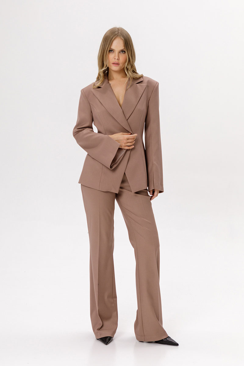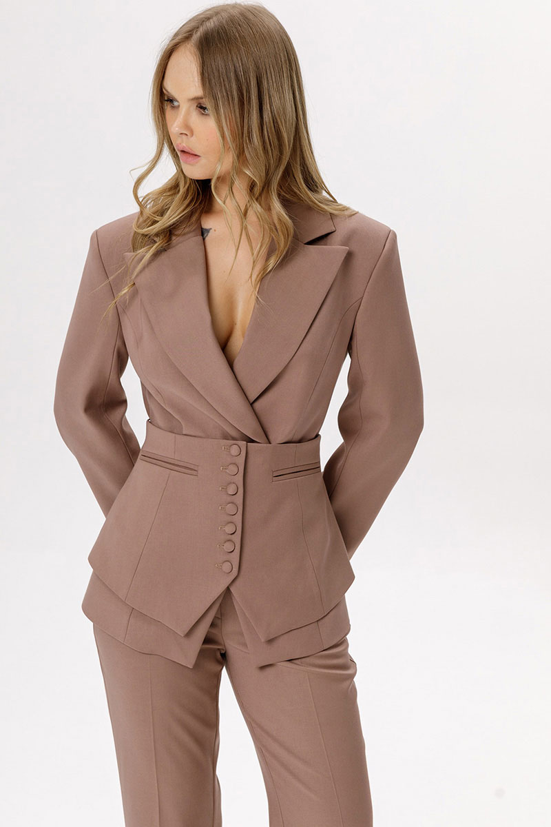 Комплект-двойка из приталенного жакета с разрезами по рукавам и съёмной баски.