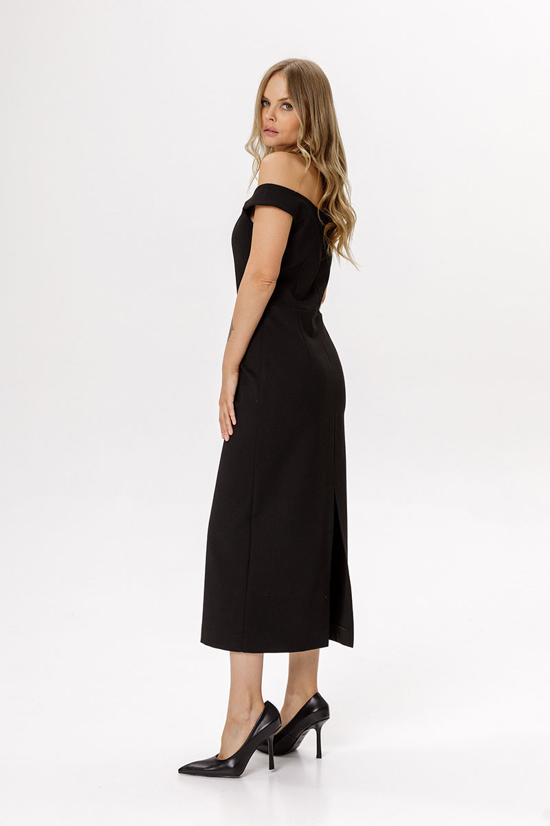 Детали: Прилегающий силуэт, платье отрезное по линии талии, рельефные швы по лифу переда, талиевые вытачки по лифу и юбке спинки, спущенные бретели, фигурный глубокий вырез горловины, потайная застёжка в среднем шве спинке, лиф платья на подкладке.