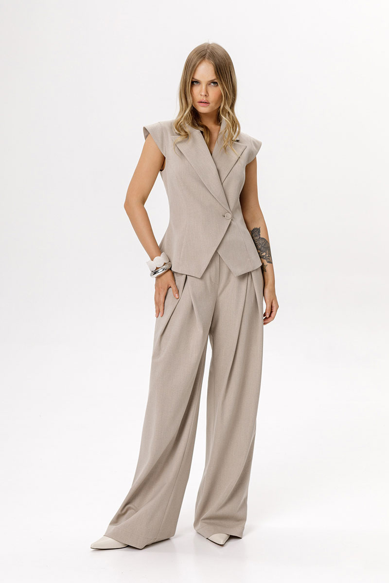 Детали: полуприлегающий силуэт, рельефные швы переда, смещённая застёжка на одну пуговицу, спинка со средним швом и талиевыми вытачками, рукав-«крыло», пиджачный воротник, хлястик-завязка по спинке, жилет на подкладке.