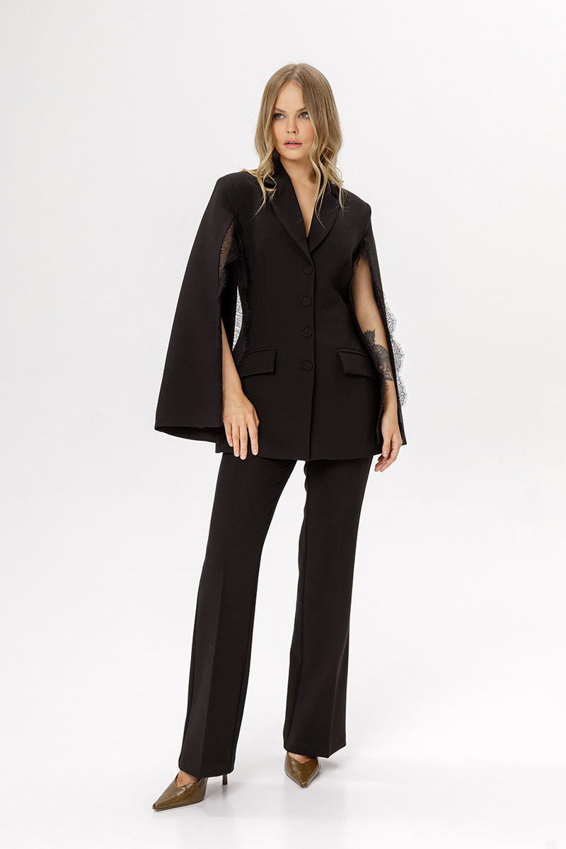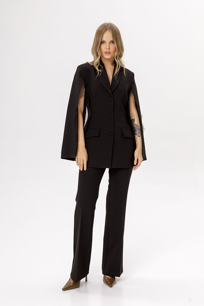 Костюм-двойка из приталенного жакета с рукавами кейп и брюк-клеш со стрелками.