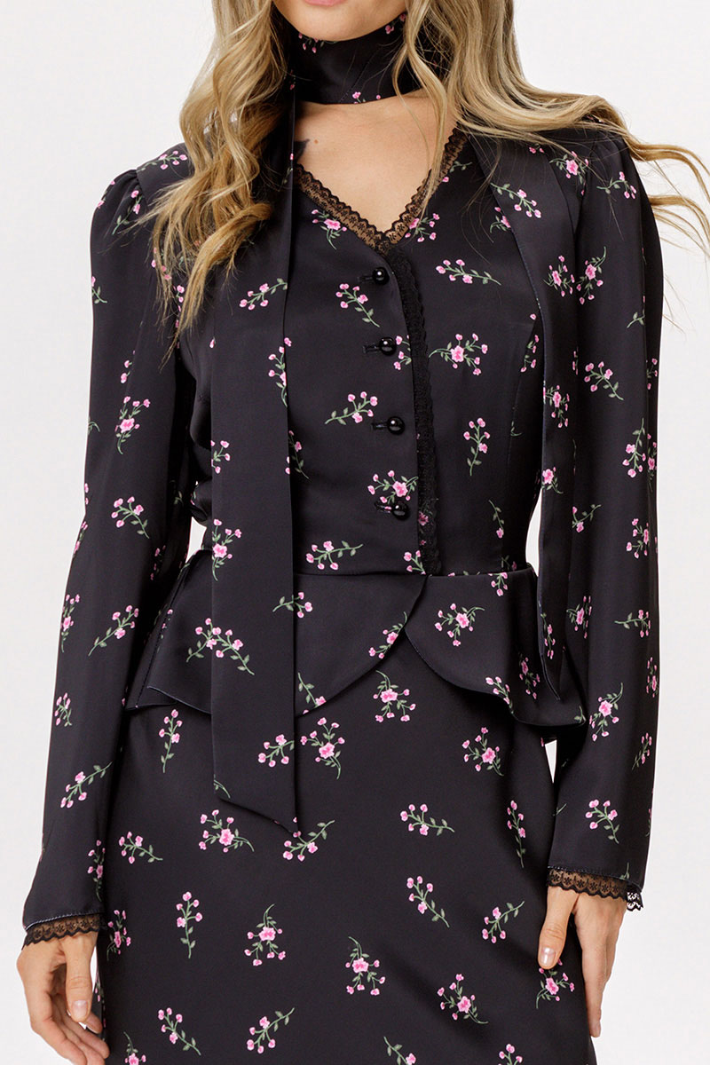Детали: приталенный силуэт, V- образный вырез горловины переда, застежка по переду на петли и пуговицы, рукава втачные с кружевом по низу, спинка с резинкой по талии, съемный шарфик, платье на подкладке 100% вискоза.