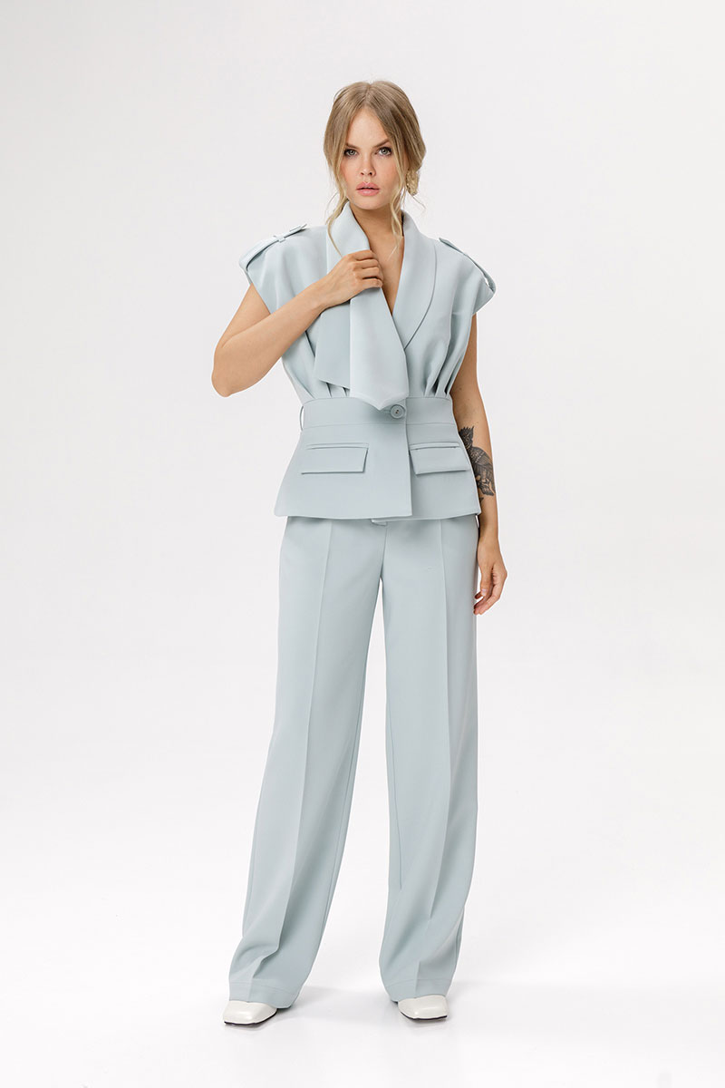 Текстильный костюм-двойка из приталенного жилета с асимметричным воротником и прямых широких брюк со стрелками.