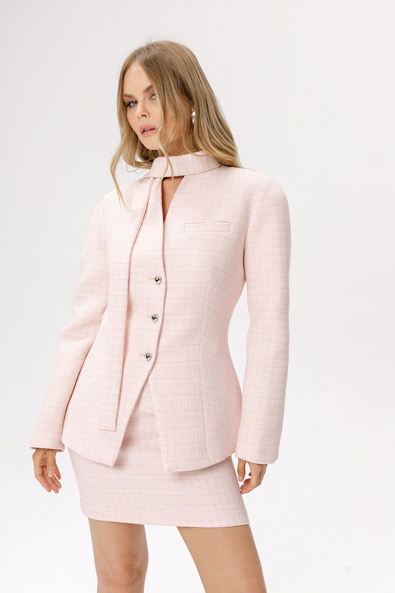 Приталенный твидовый жакет с акцентными плечами и съемным шарфиком.