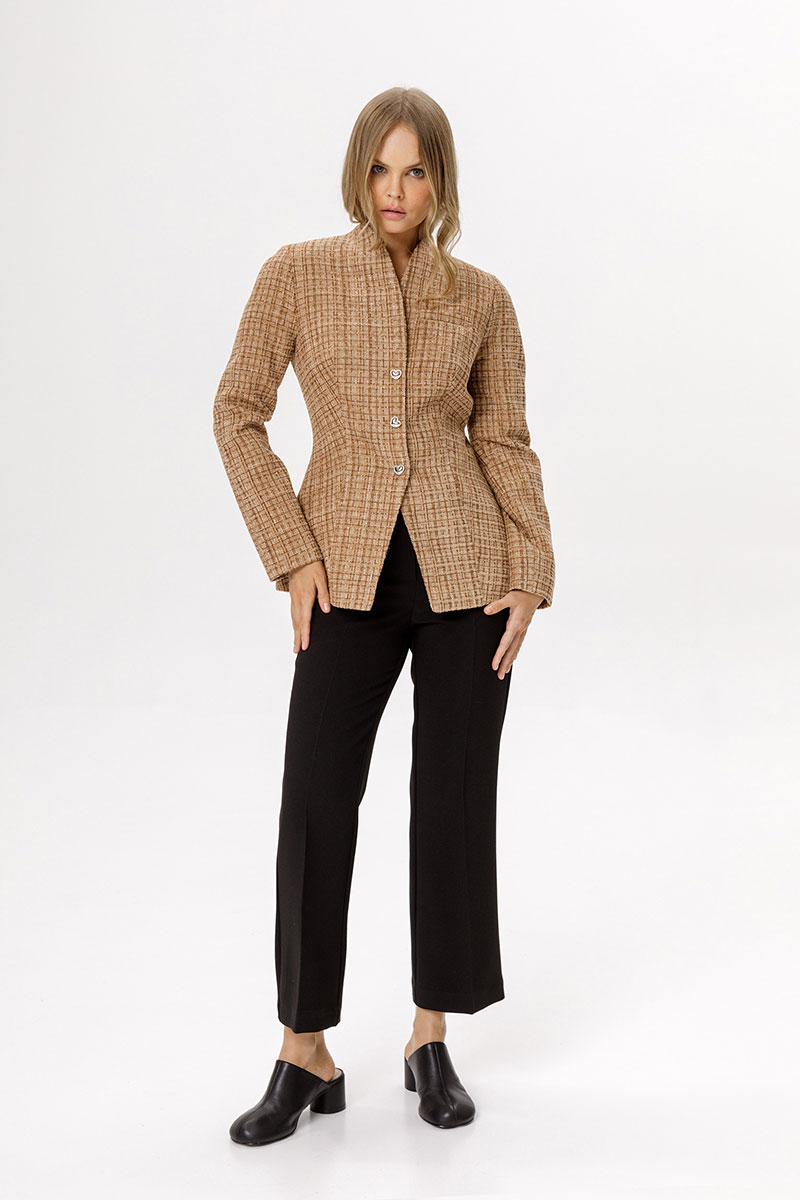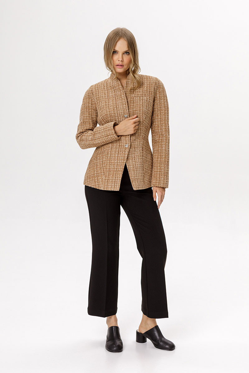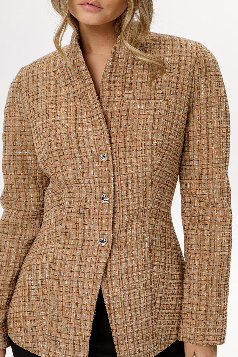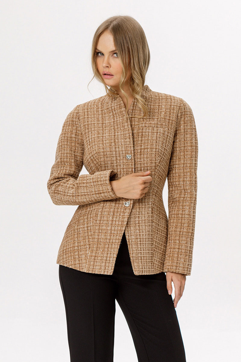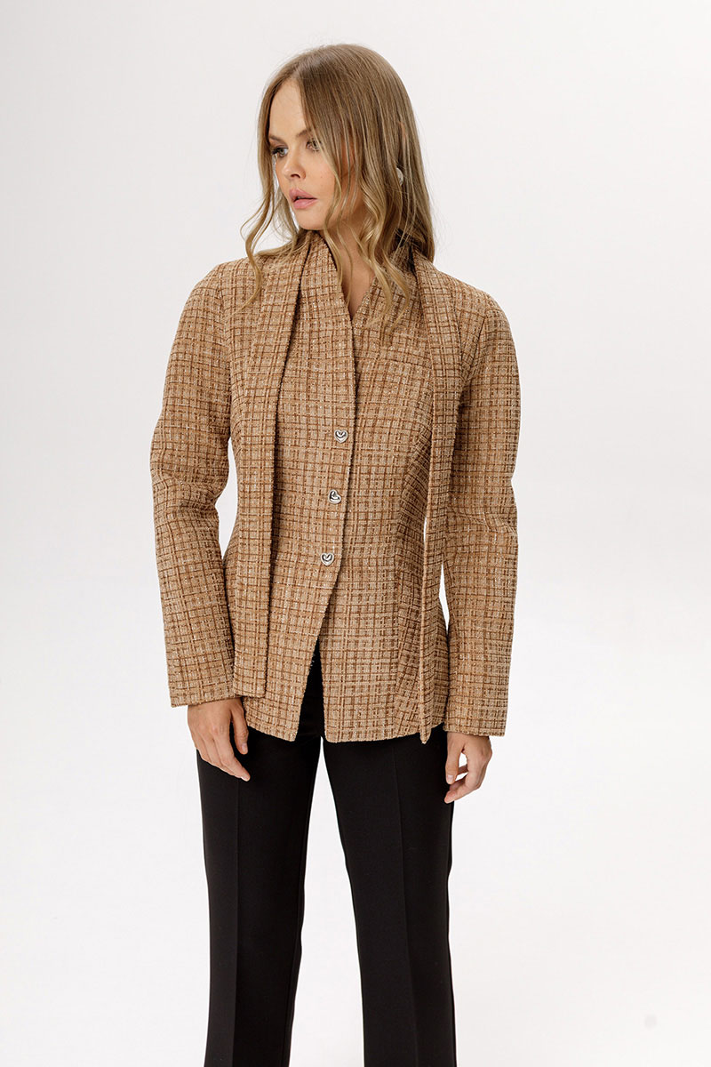 Приталенный твидовый жакет с акцентными плечами и съемным шарфиком.