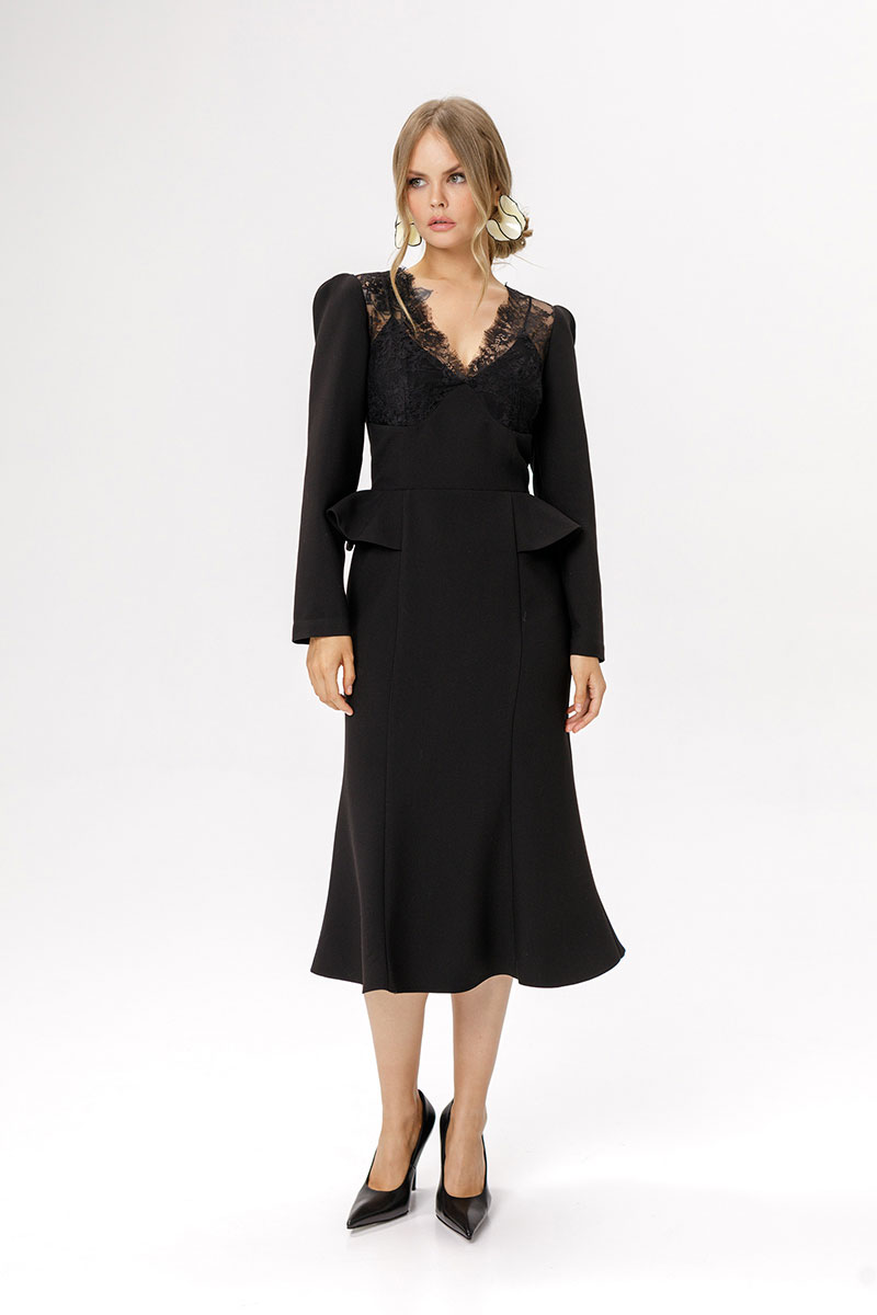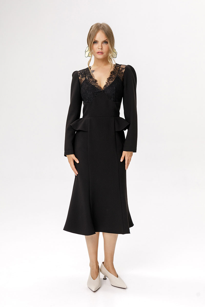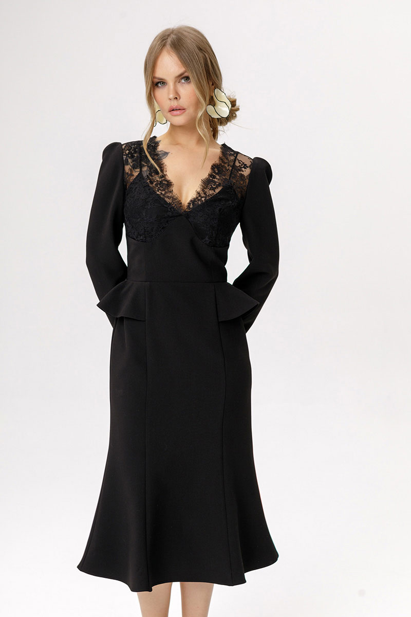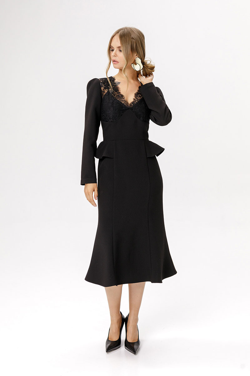 Приталенное платье с кружевным лифом и отлетными деталями по талии.