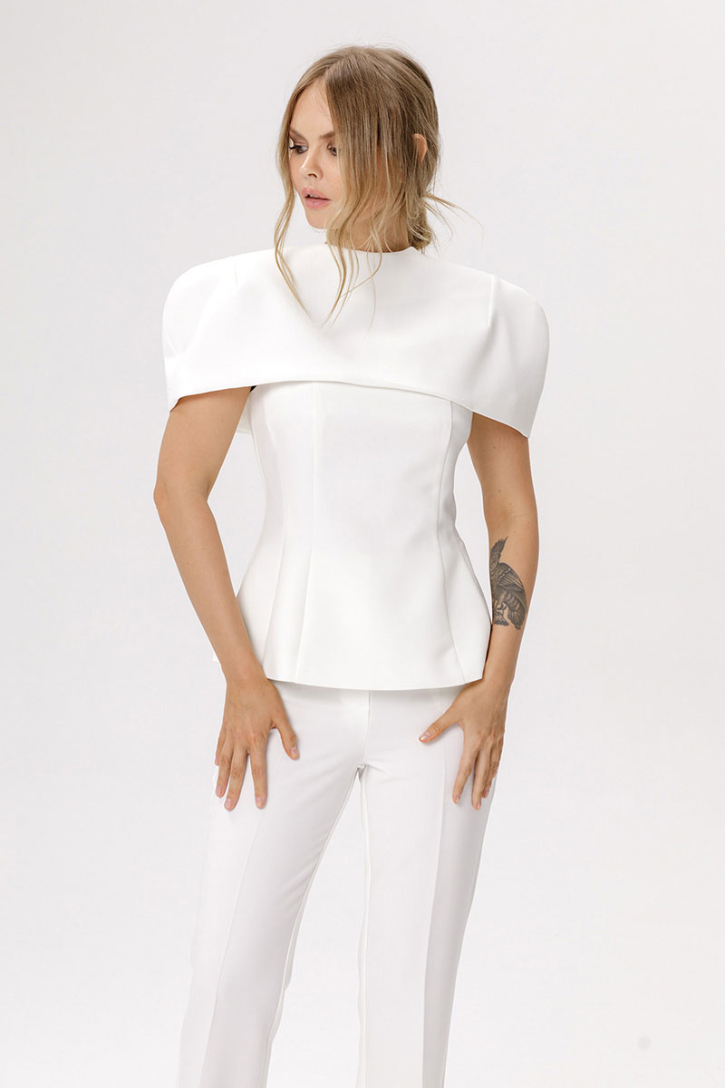 Детали: блуза прилегающего силуэта, кареобразный вырез горловины переда и спинки, рельефные швы, потайная застежка по спинке, на подкладке. Кейп с круглой горловиной и вытачками по плечам, плечевые накладки, застежка на навесную петлю и пуговицу, на подкладке. Кейп не имеет переда и спинки.