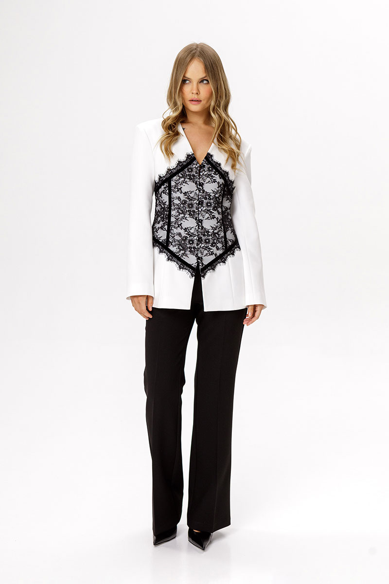 Детали: полуприлегающий силуэт, V-образный вырез горловины, талиевые вытачки переда и спинки, спинка со средним швом, втачные двухшовные рукава, застёжка на навесные петли и пуговицы, отделка кружевом и бархатной лентой, жакет на подкладке.
