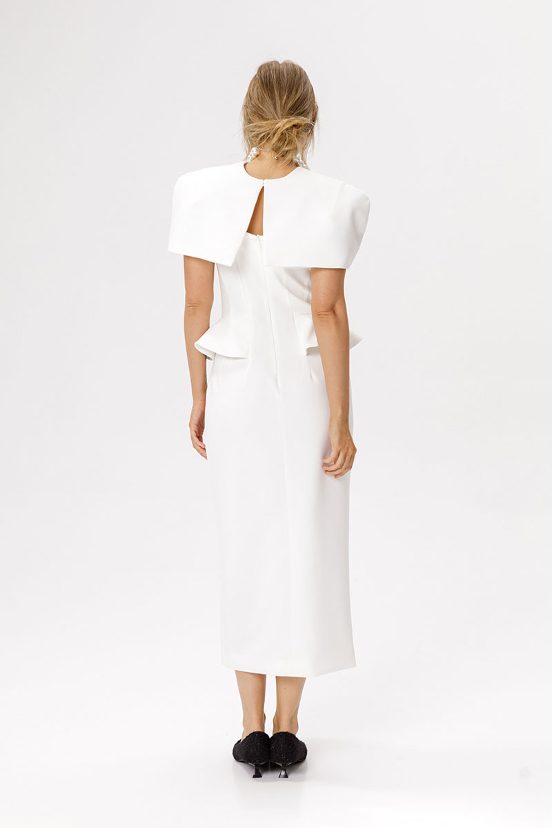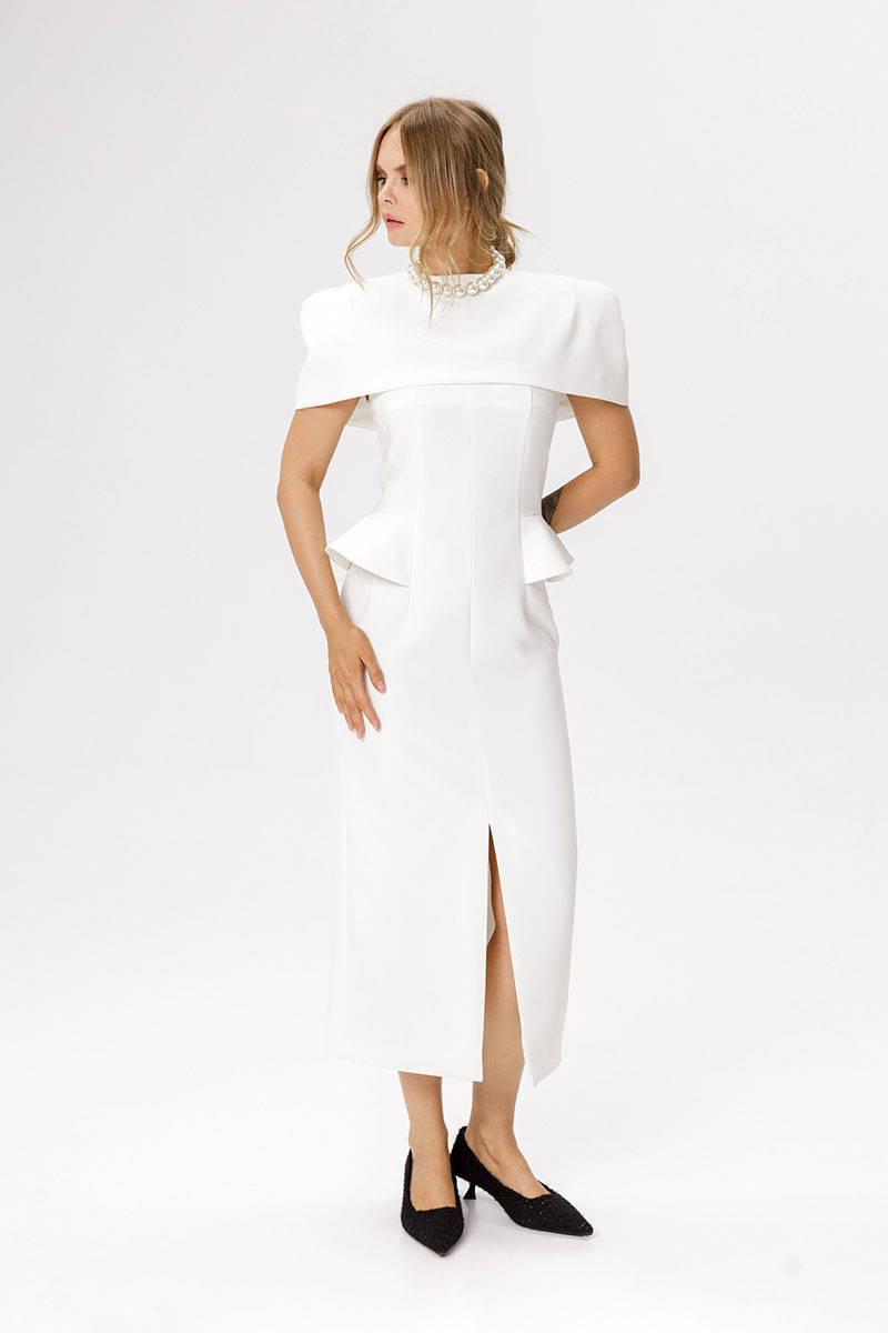 Приталенное миди-платье с глубоким вырезом и отлетными деталями по талии.