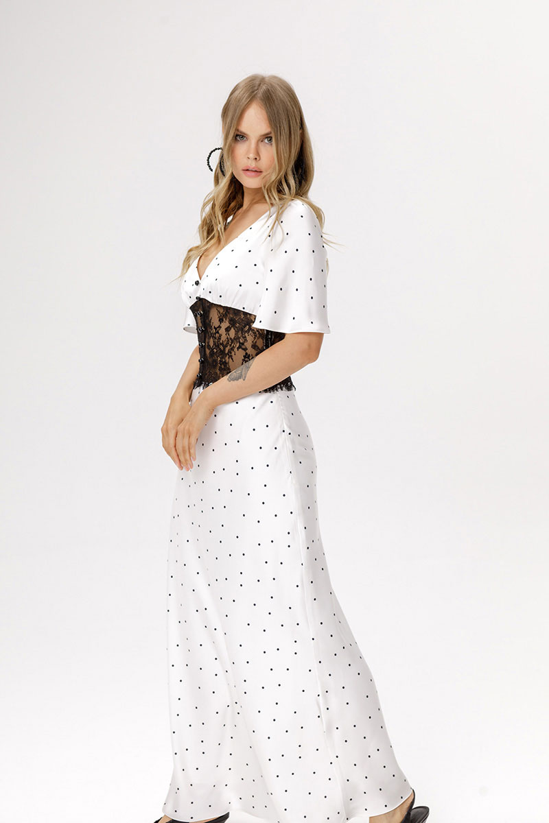Платье-комбинация длины макси с кружевным широким поясом.