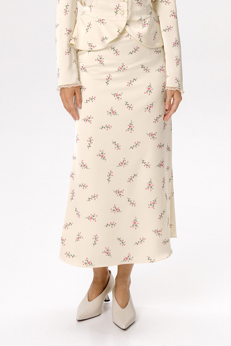 Атласный костюм-двойка из приталенной блузы с баской и юбки длины миди.