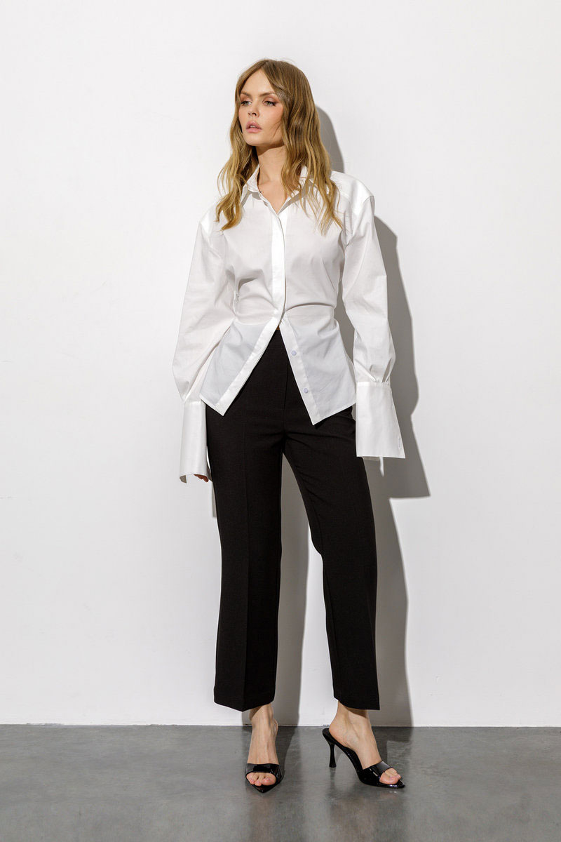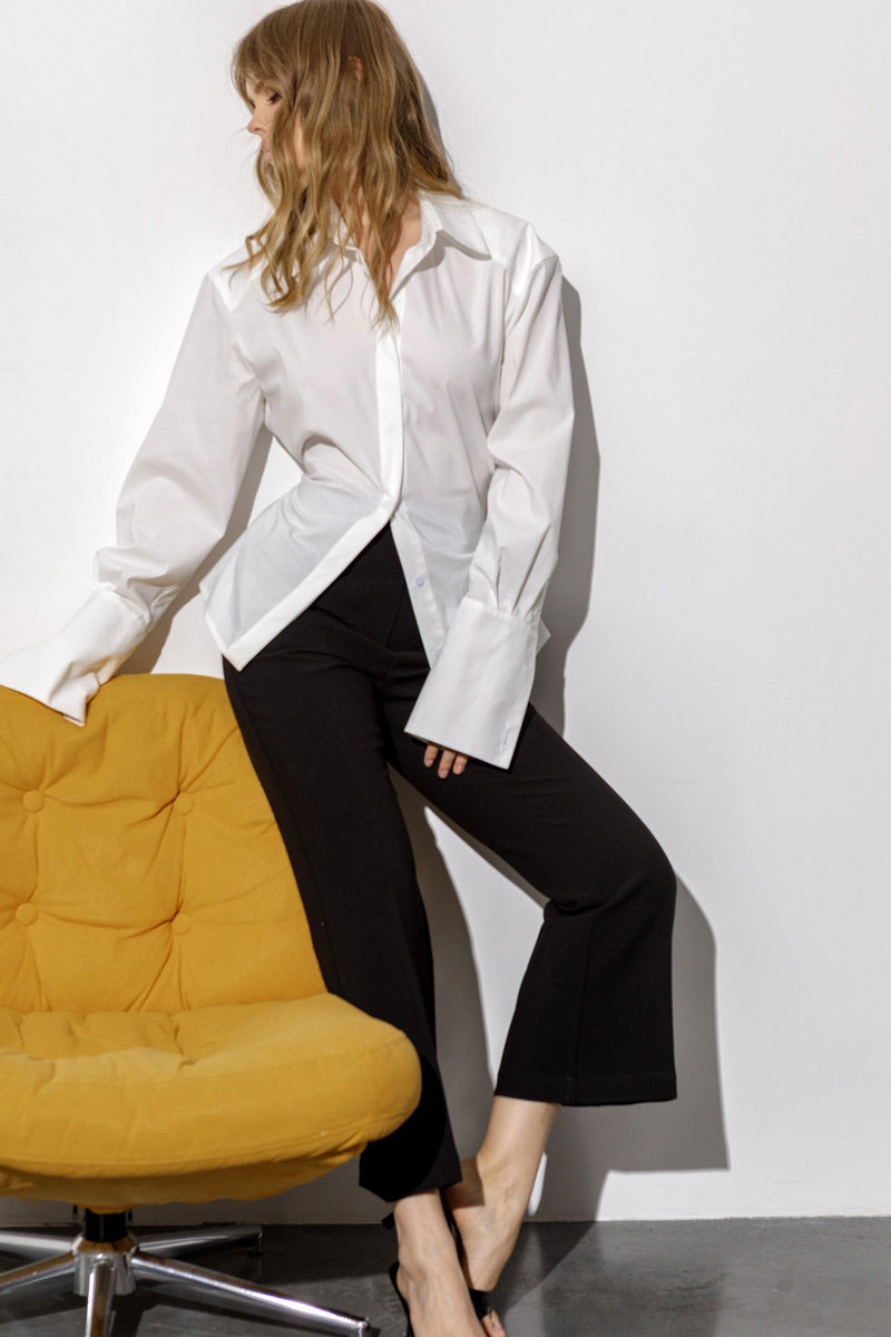 Детали: приталенный силуэт, расширенная линия плеча, кокетка по переду и спинке, длинный рукав с широкой притачной манжетой, рубашечный воротник, центральная потайная застёжка на 7 пуговиц, петли в боковых швах.
