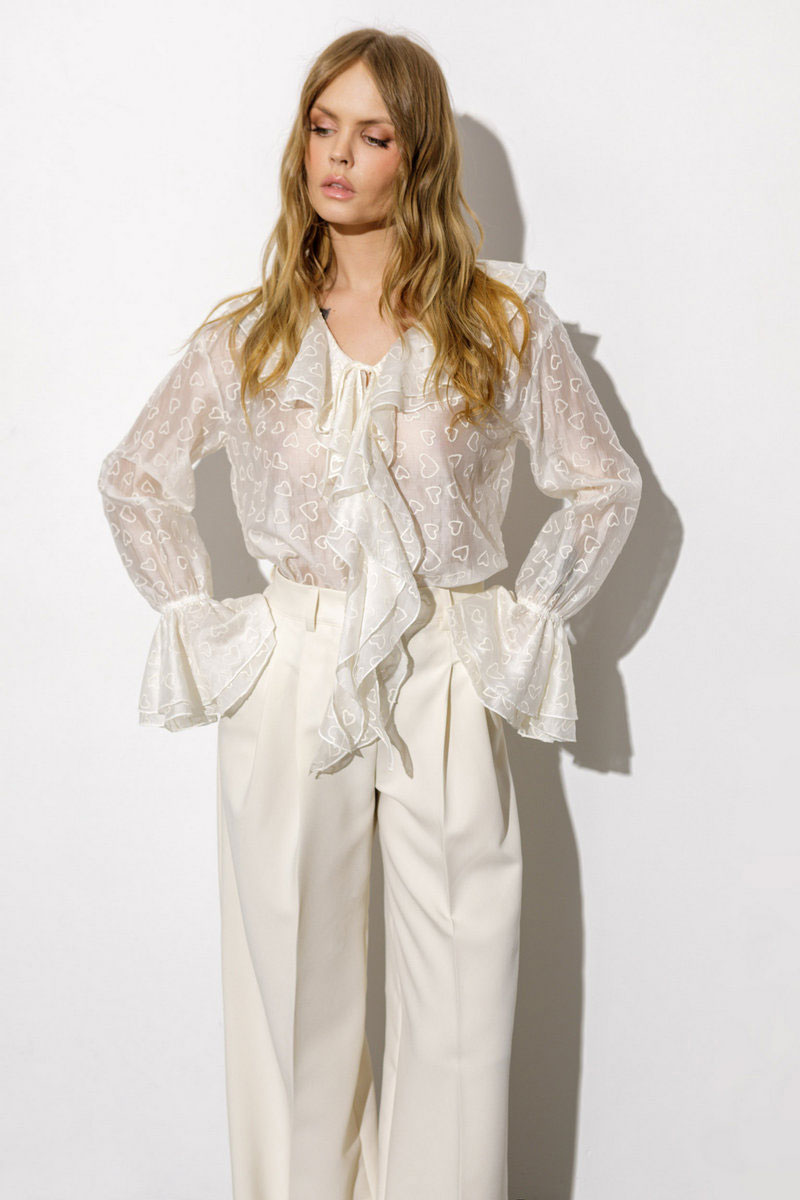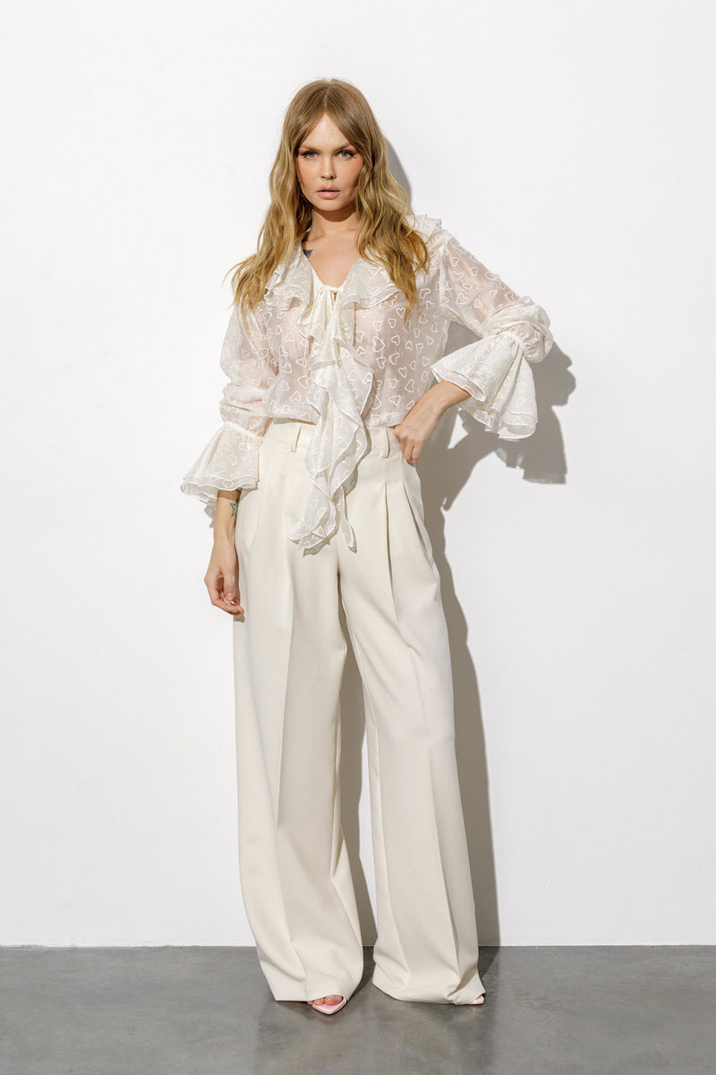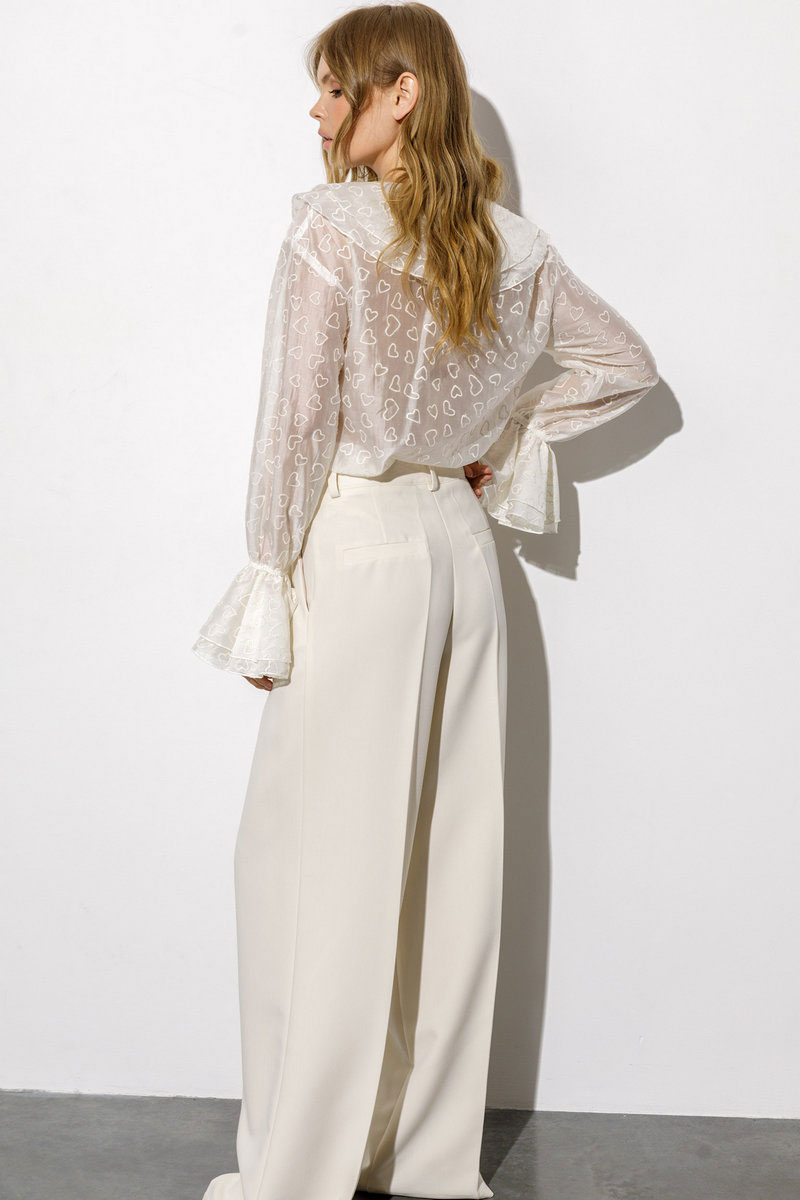 Комплект-двойка из полупрозрачной блузы с вышивкой и широких брюк-палаццо со стрелками.