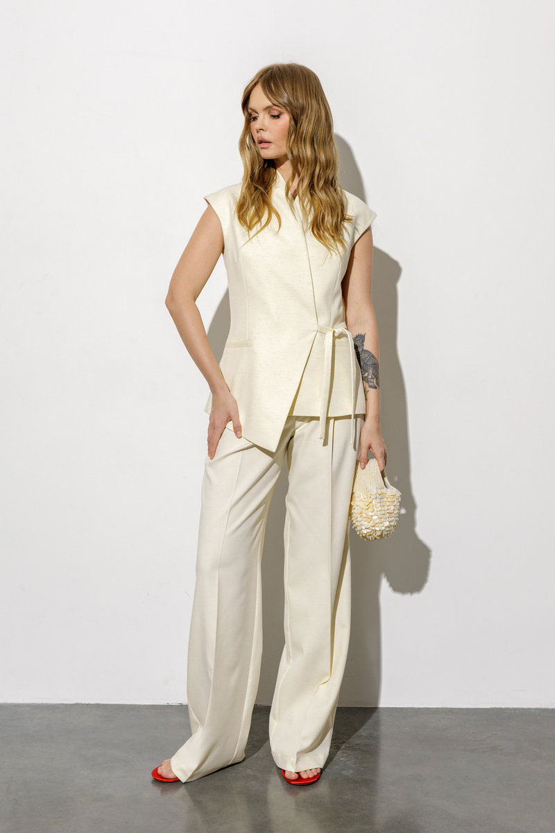 Детали: жилет прилегающего силуэта, талиевые вытачки по переду и спинке, фигурный борт со смещённой застёжкой на завязку, спинка со средним швом, функциональные карманы с листочками, воротник с цельнокроенной стойкой, жилет на подкладке.
