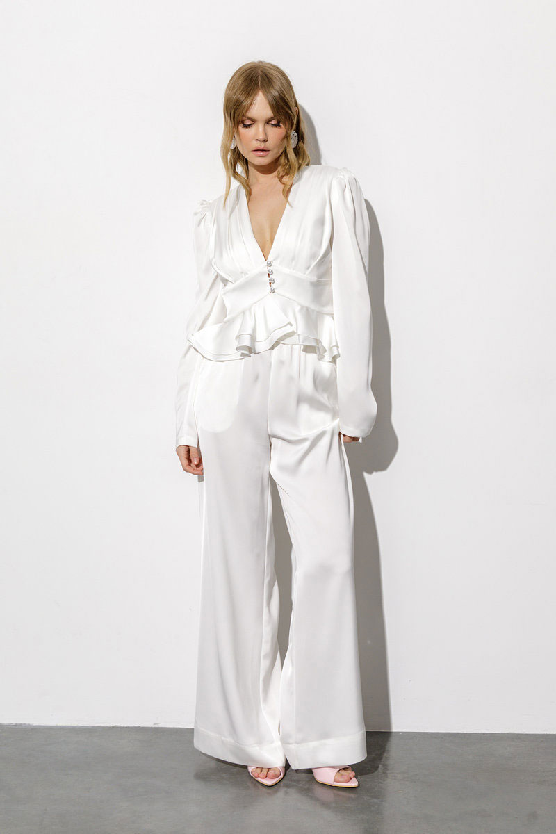 Атласная блуза с воланами и глубоким вырезом (приобрести брюки с фото можно по арт. 6705).