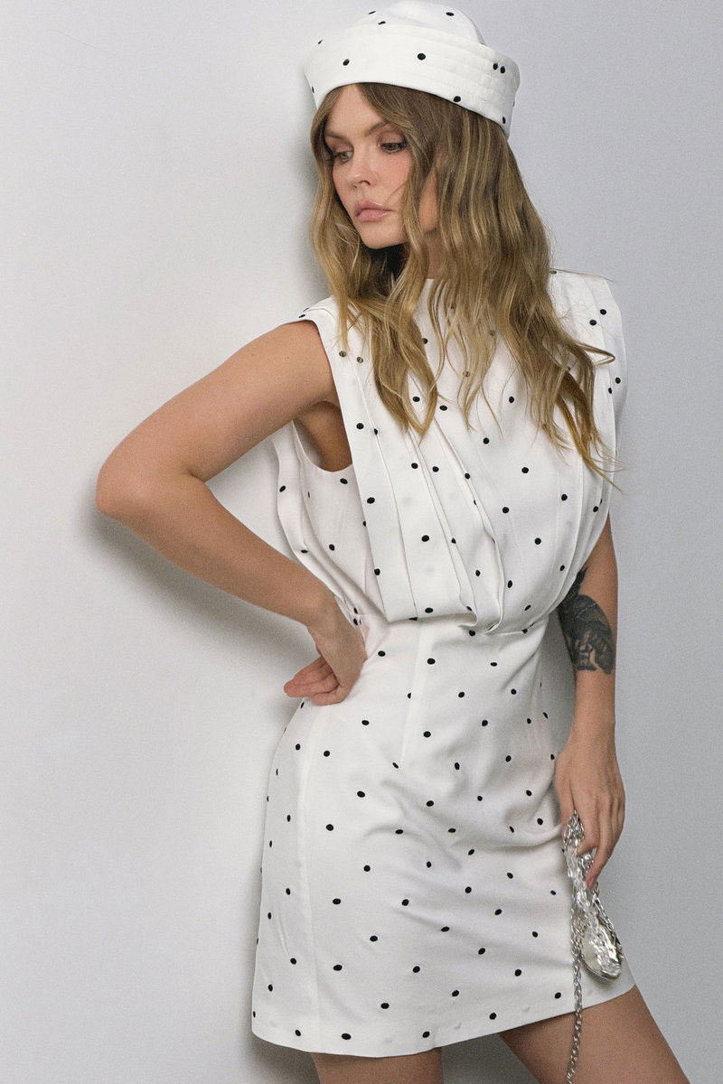 Комплект-двойка из мини-платья без рукавов и панамы в горошек.
