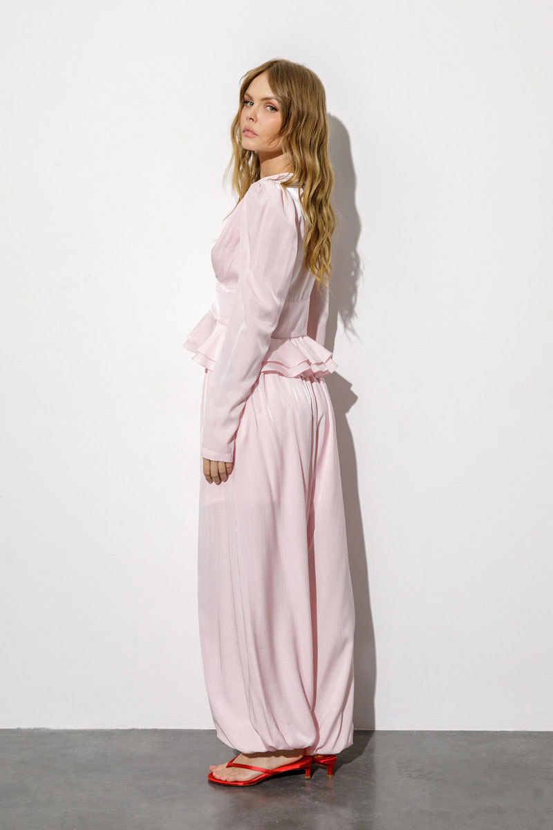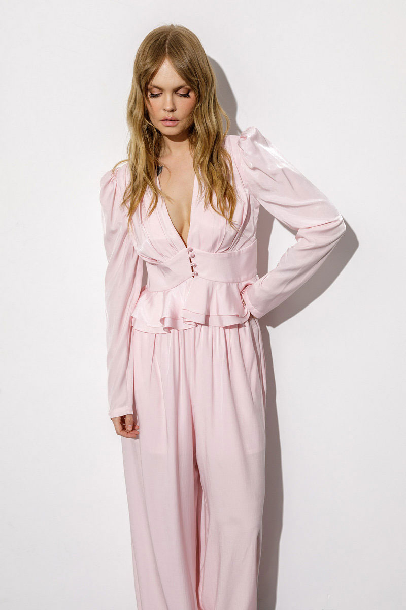 Детали: блуза приталенного силуэта, глубокий V-образный вырез переда с застежкой на навесные петли и пуговицы, пояс-кокетка с воланами, длинные рукава со сборкой по окату, фигурный низ, лиф на подкладке.
