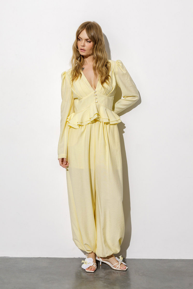 Костюм-двойка из блузы с воланами и широких свободных брюк-алладинов.