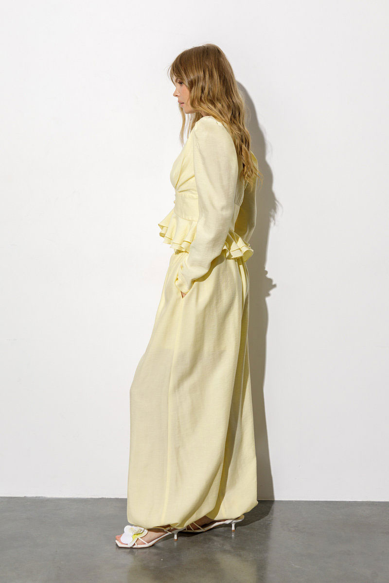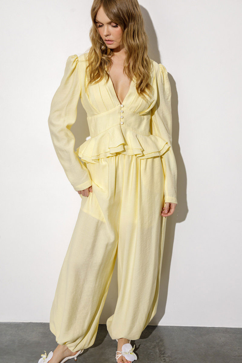 Детали: брюки с высокой посадкой на притачном эластичном поясе, без застежки, боковые карманы, низ брюк с эластичными манжетами, брюки без подкладки.