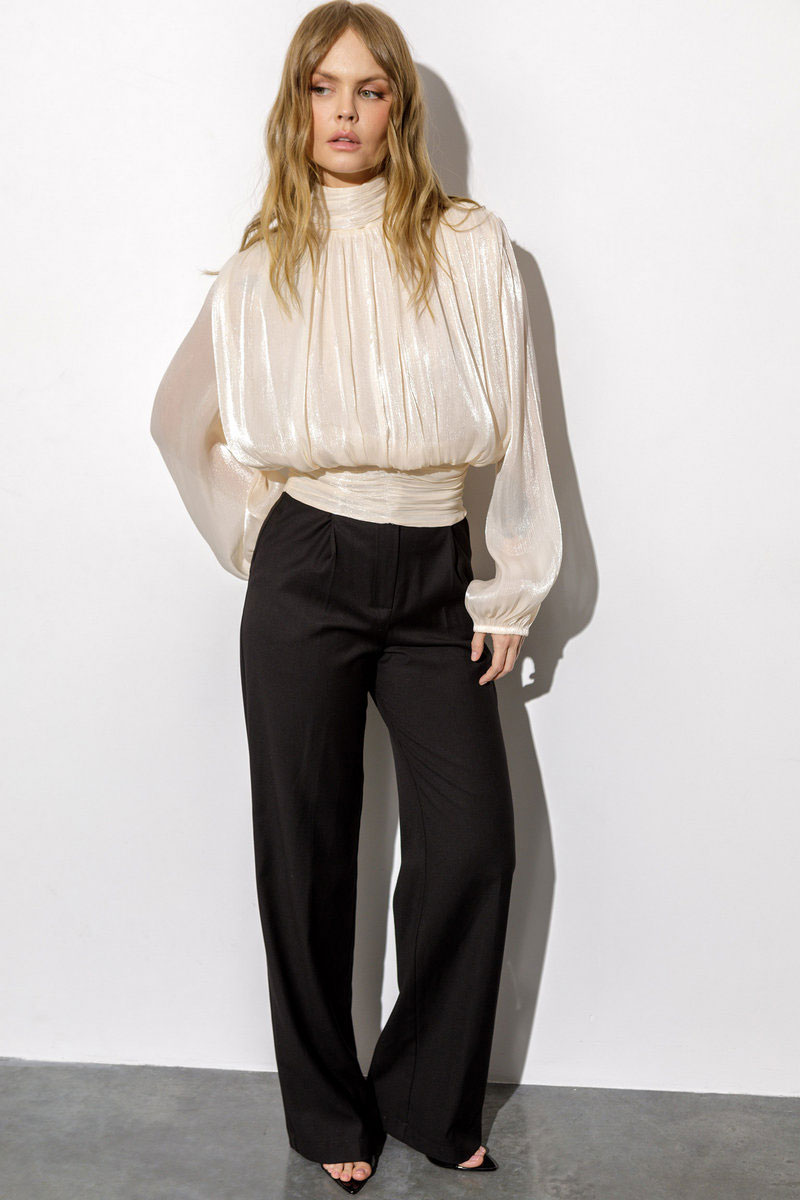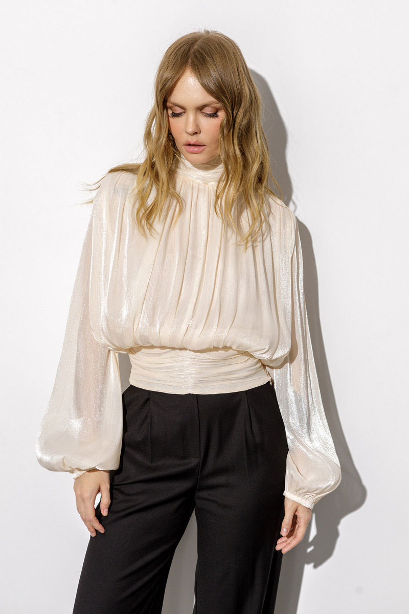 Детали: блуза приталенного силуэта, перед и спинка свободного покроя, пояс блузы со сборкой, расширенные плечи, сборки по плечам и горловине, застёжка на потайную молнию в боковом шве, воротник стойка со сборкой и застёжкой на навесные петли и пуговицы, втачные расширенные к низу рукава с резинкой по низу.