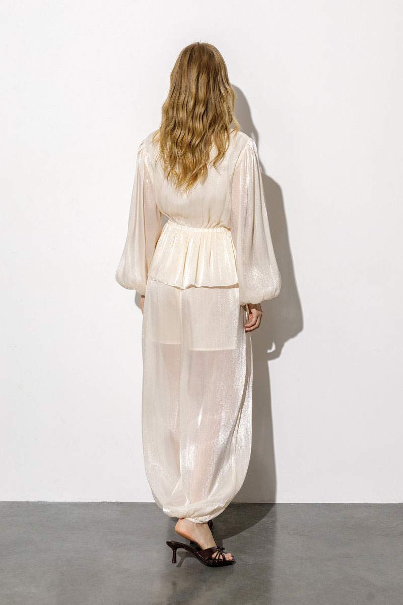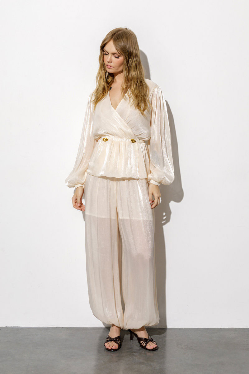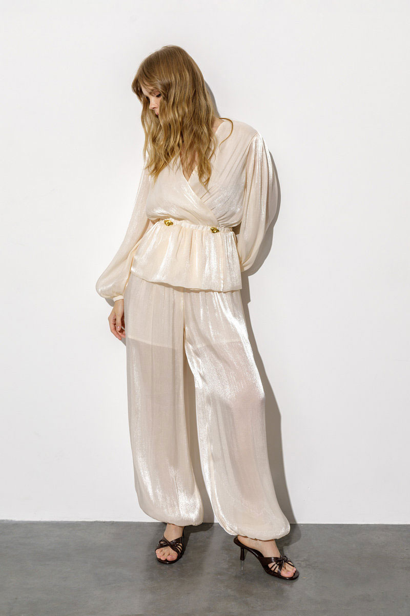 Костюм-двойка из блузы и широких свободных брюк-алладинов из фактурного шифона.