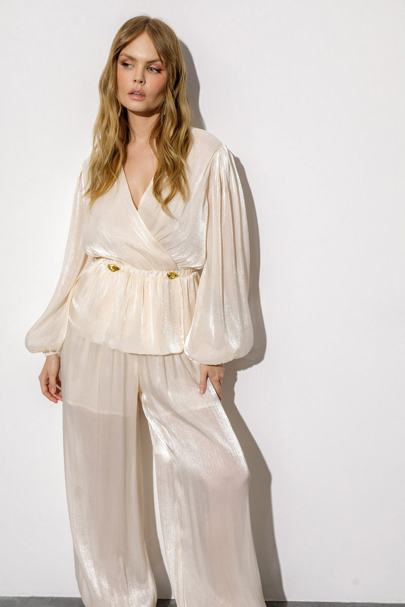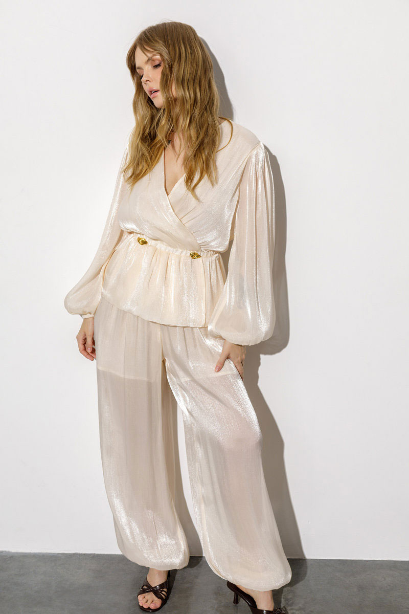 Детали: блуза приталенного силуэта и свободного покроя, глубокий V-образный вырез переда на запах, имитация застежки с декоративными пуговицами, талия с резинкой, длинные рукава со сборкой по окату и притачными эластичными манжетами, блуза на хлопковой на подкладке. Брюки с высокой посадкой на притачном эластичном поясе, без застежки, боковые карманы, низ брюк с эластичными манжетами, брюки на хлопковой подкладке.