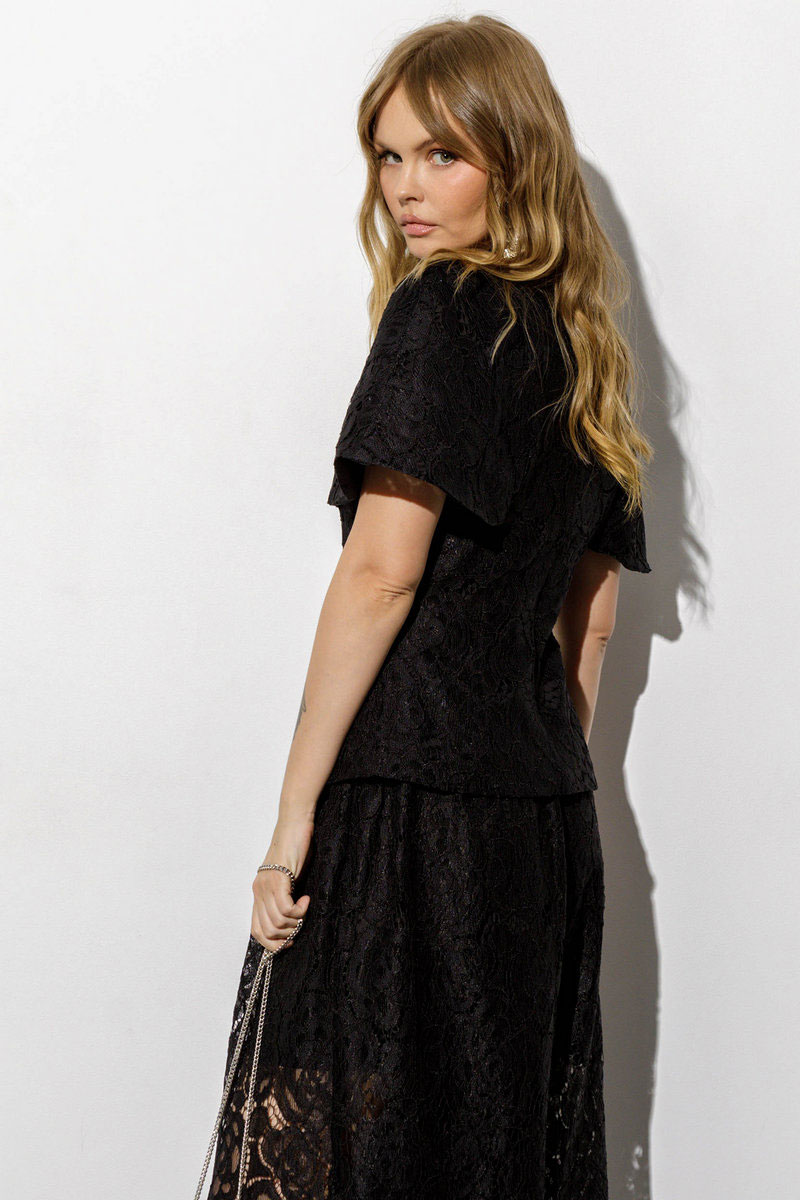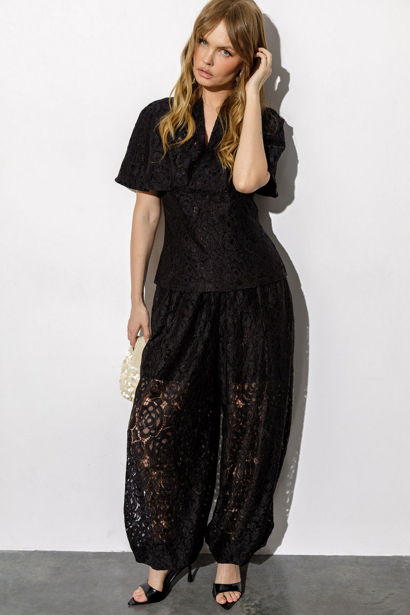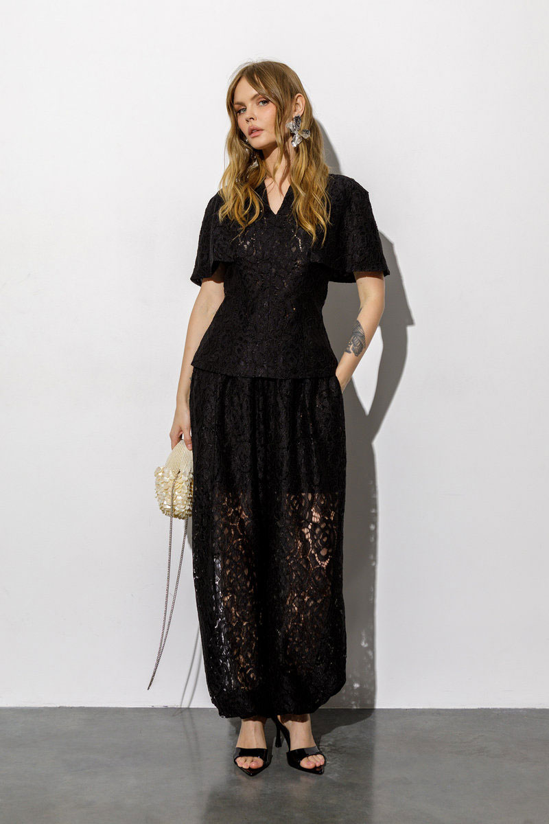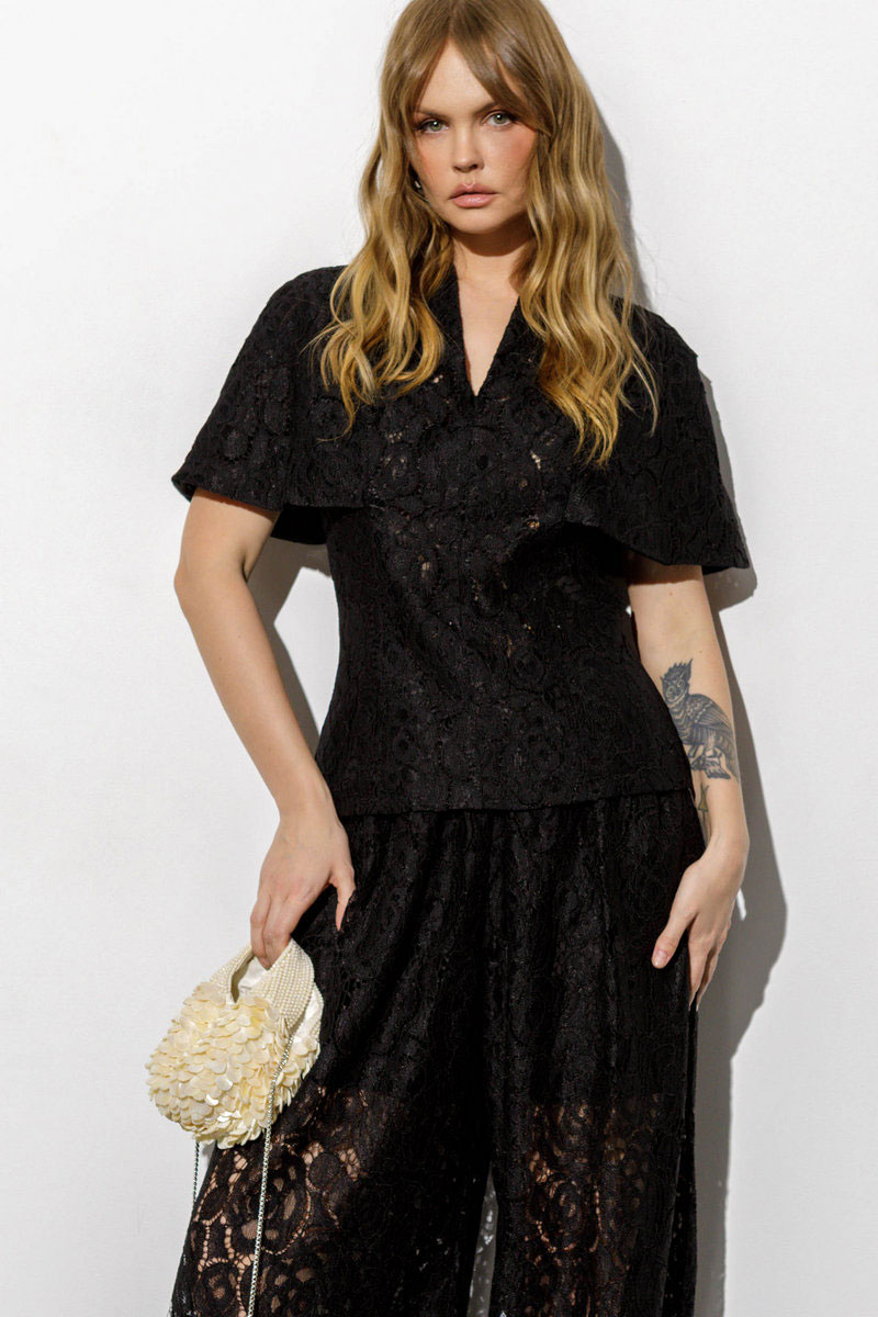 Кружевная блуза-кейп приталенного силуэта и цельнокроеной пелериной.