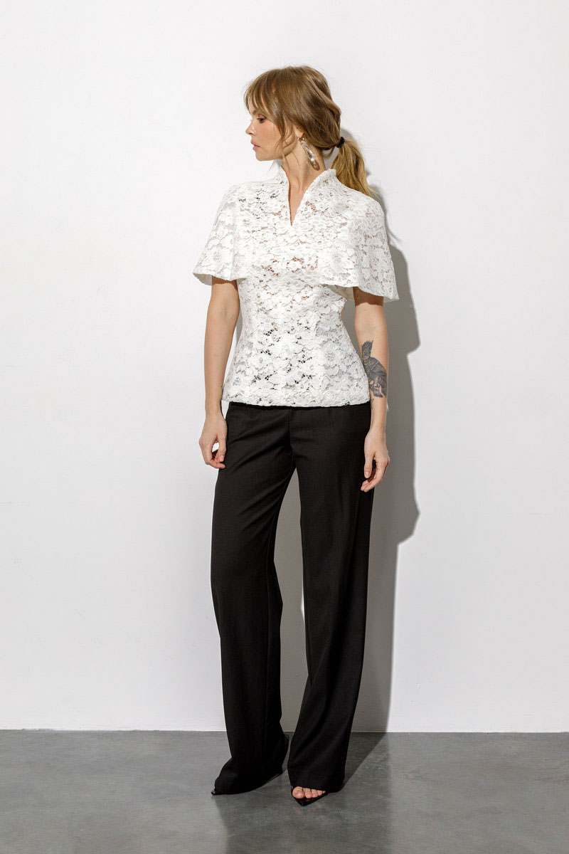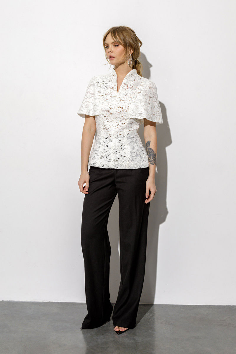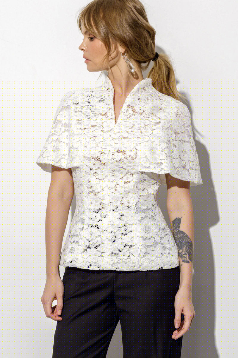 Кружевная блуза-кейп приталенного силуэта и цельнокроеной пелериной.