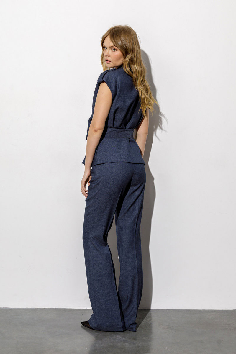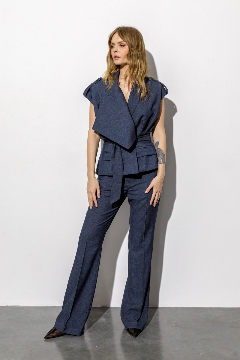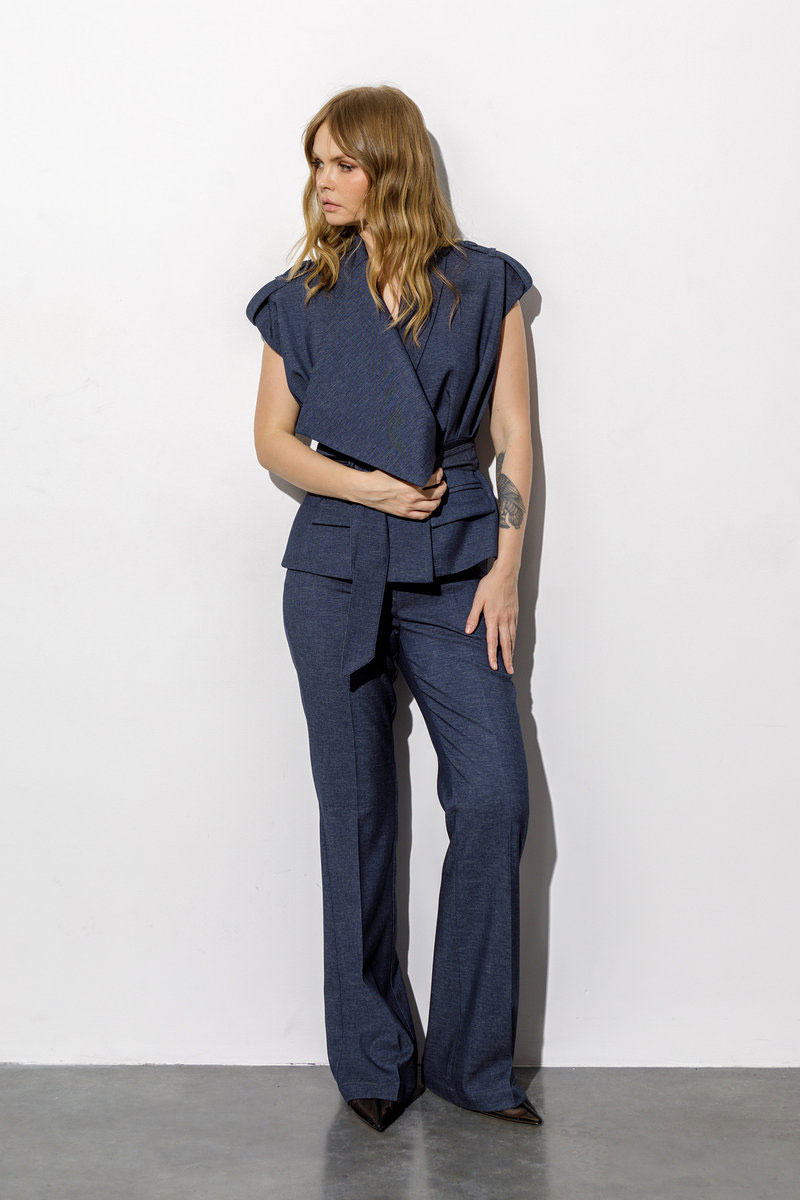Костюм-двойка из приталенного жилета с асимметричным воротником и брюк-клёш со стрелками из текстильной ткани под джинс.