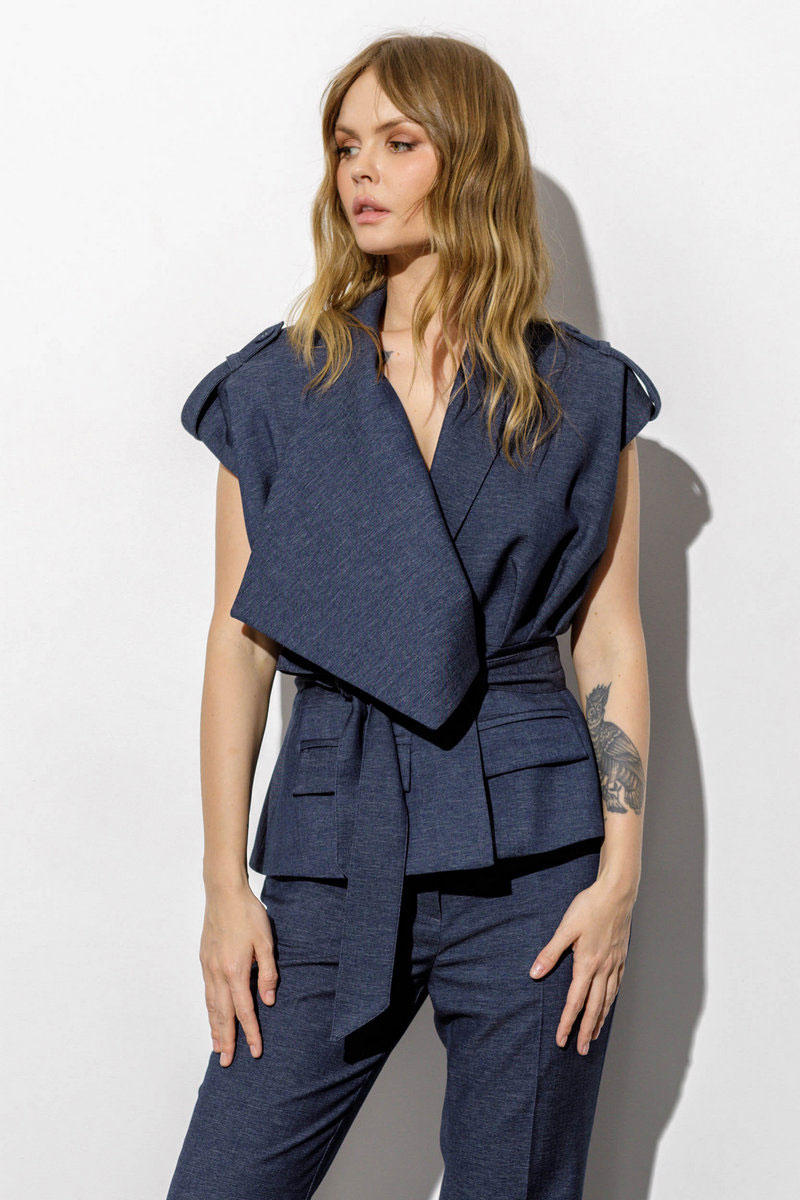 Детали: жилет приталенного силуэта, асимметричный воротник, отрезная линия талии со складками, спущенное плечо, функциональные карманы, застежка на петли и пуговицы, съемный пояс, жилет на подкладке. Брюки с притачным поясом со шлёвками, наклонные карманы в боковом шве, застёжка на молнию и потайной крючок, талиевые вытачки на передних и задних частях брюк.