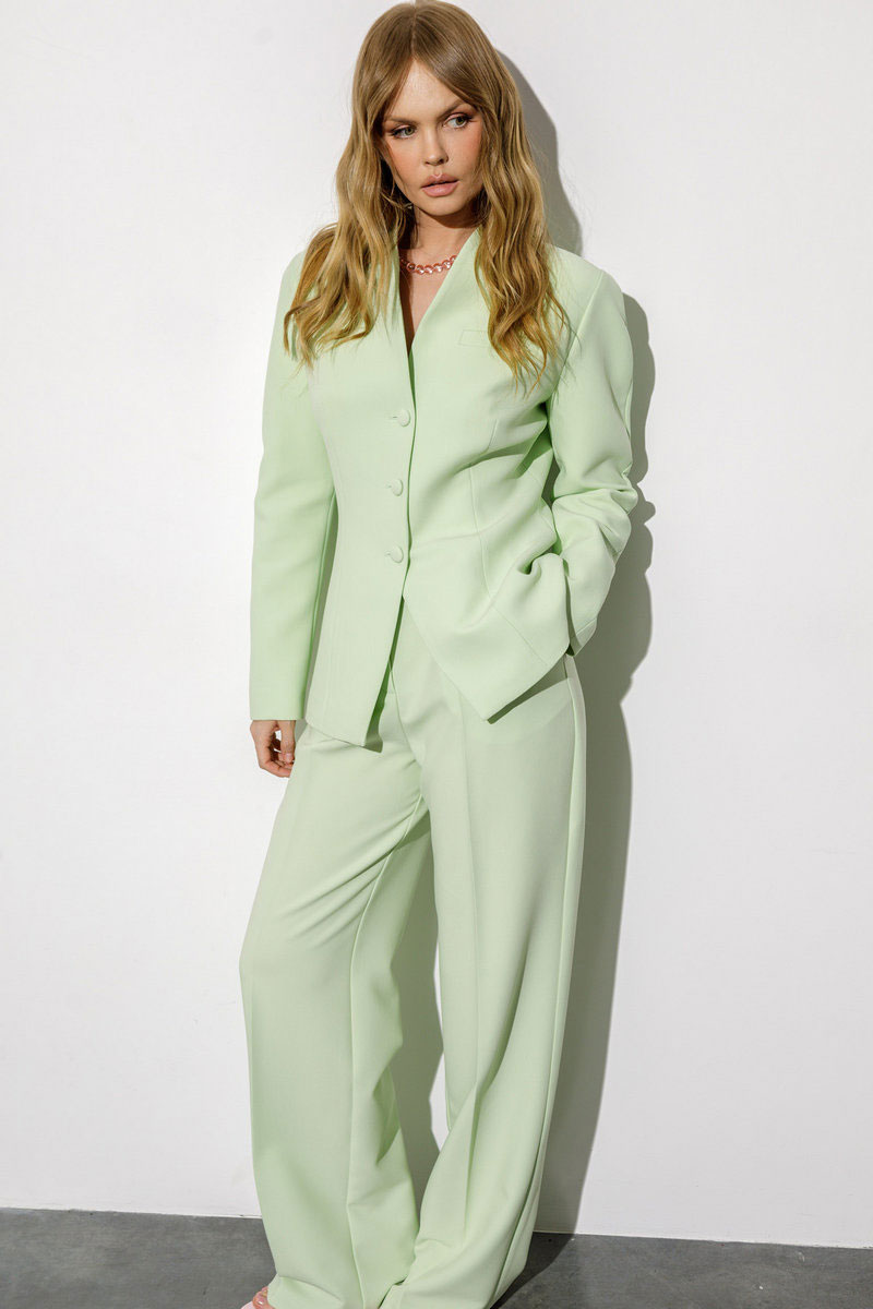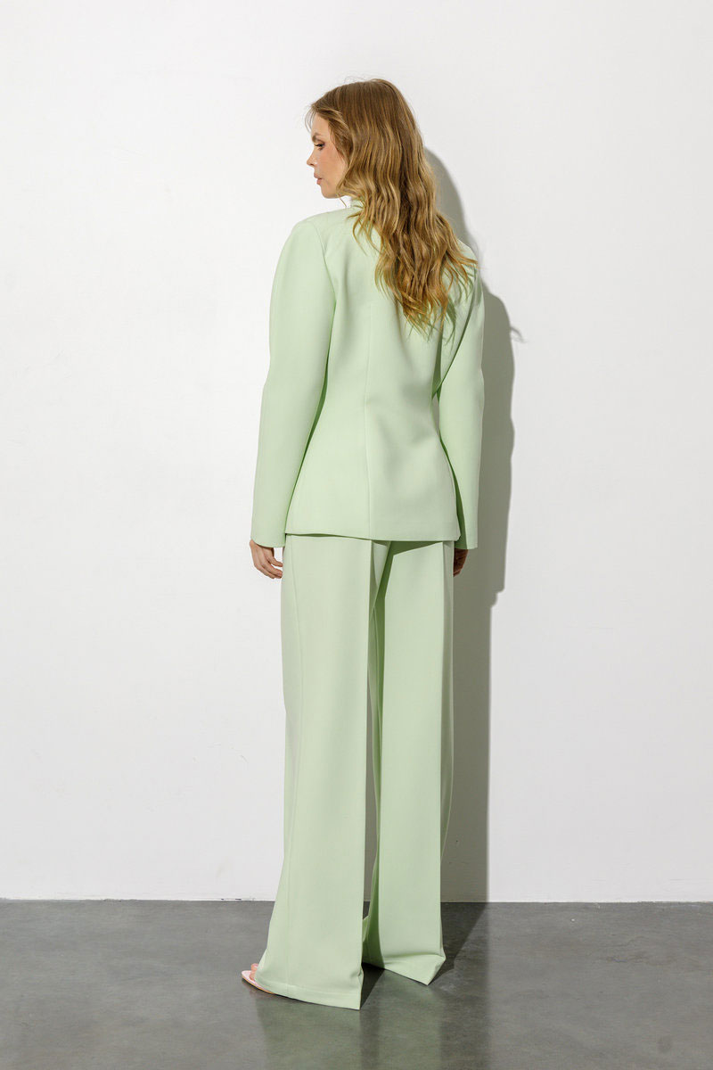 Костюм-двойка из приталенного жакета с акцентными плечами и прямых широких брюк.