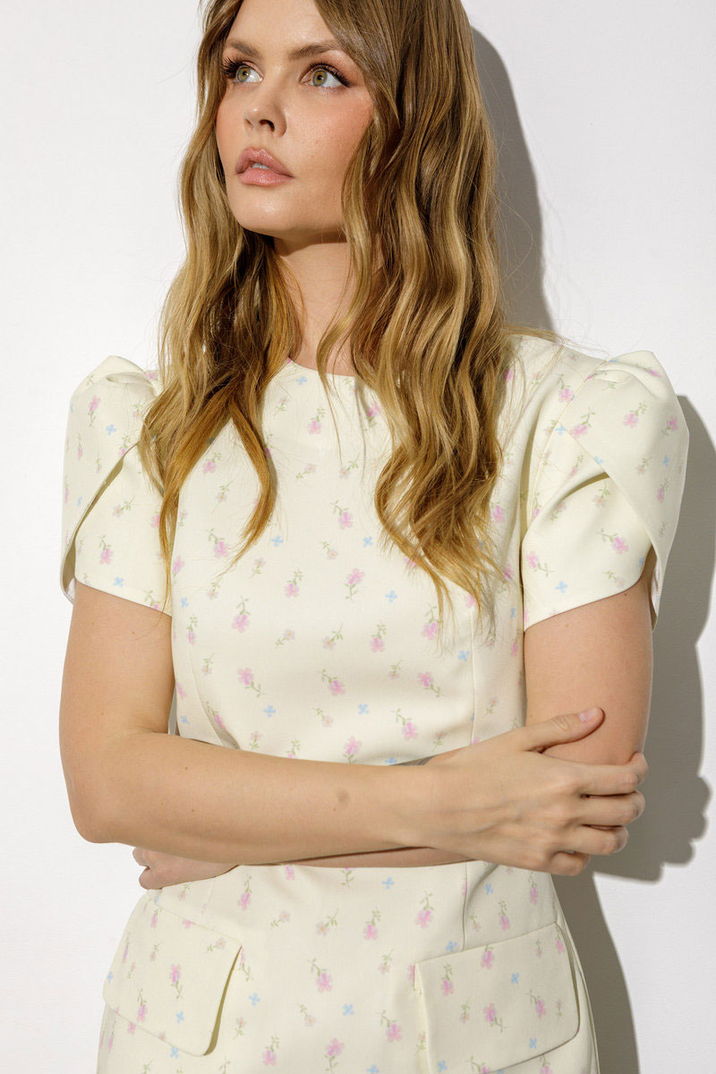 Мини-платье с рукавом «фонариком» из принтованной ткани.
