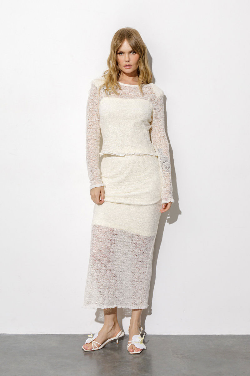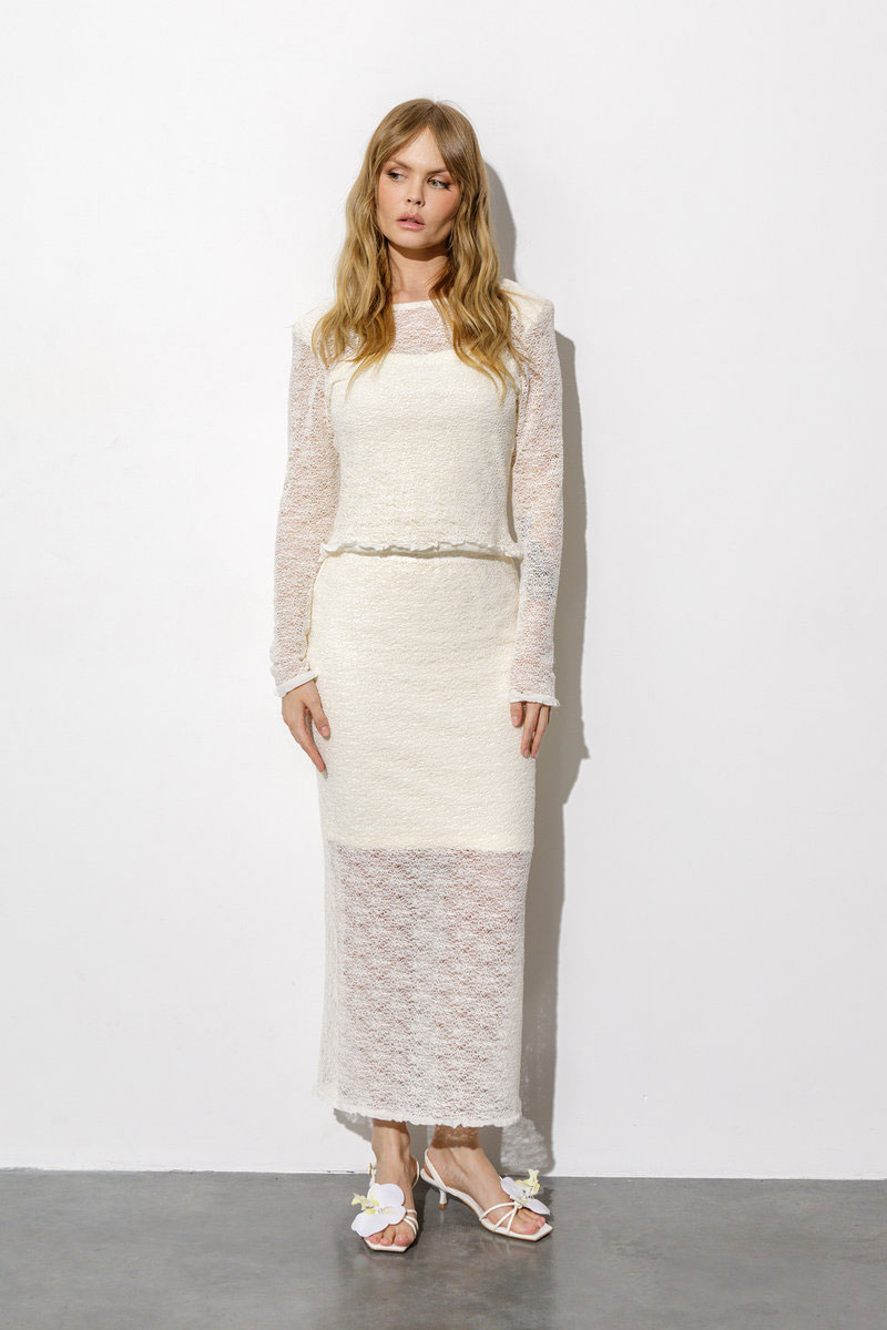 Детали: юбка прямого силуэта, пояс-резинка, подкладка, спинка со средним швом и высоким разрезом, низ с оборками.