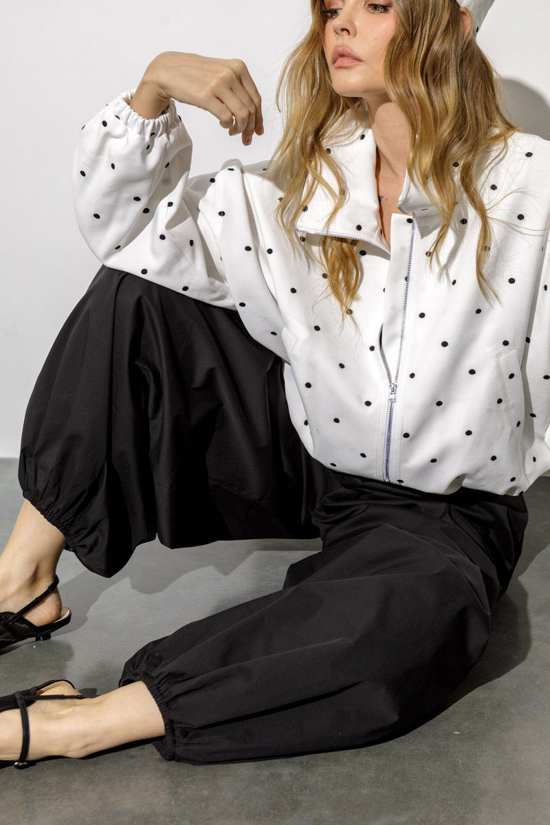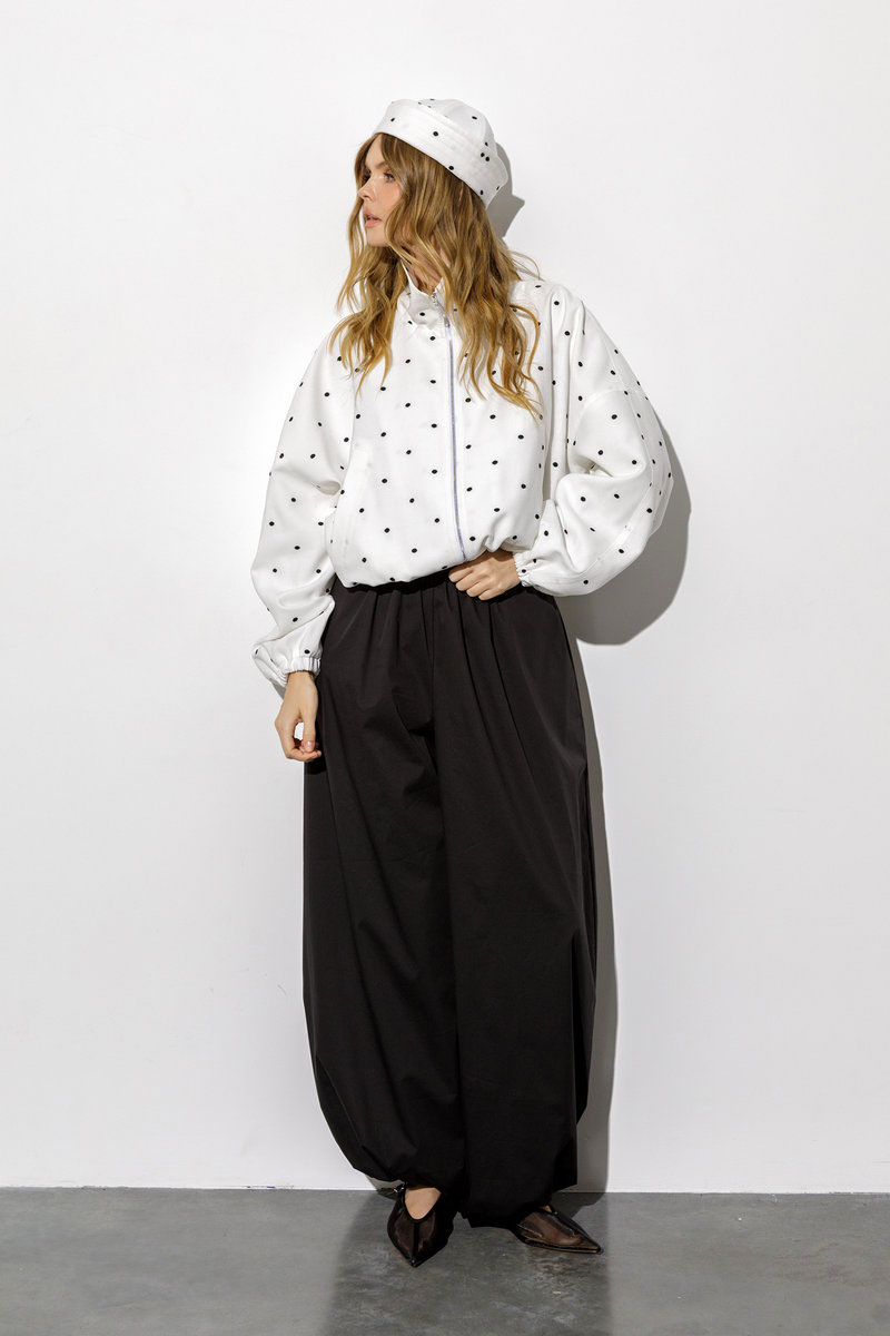 Комплект-тройка из укороченной ветровки О-силуэта, панамы в горошек и широких свободных брюк-алладинов.
