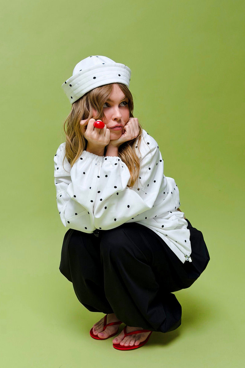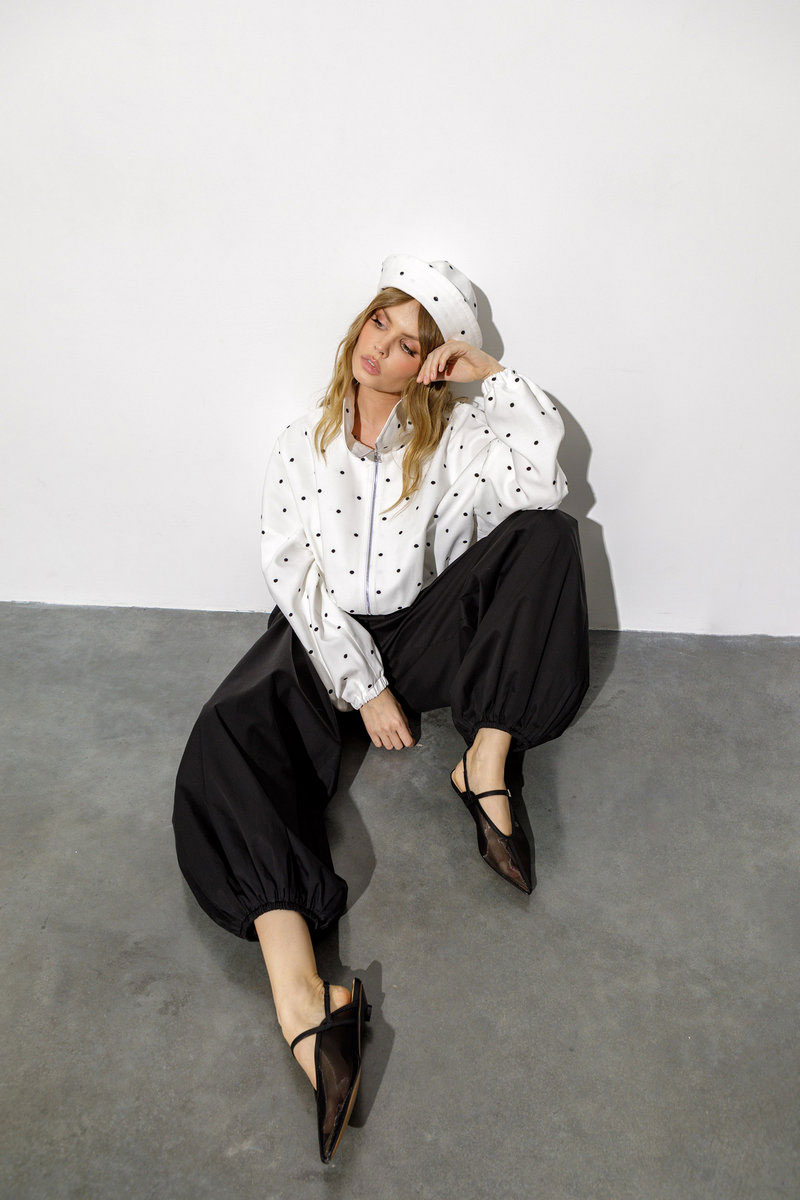 Укороченная ветровка в горошек О-силуэта.