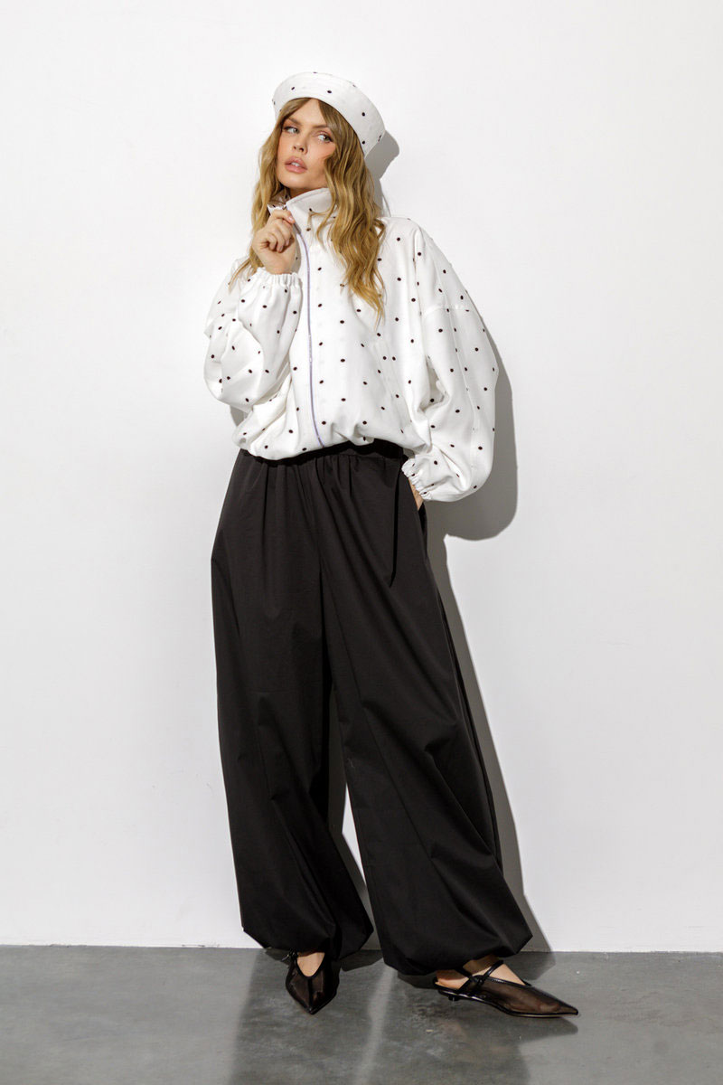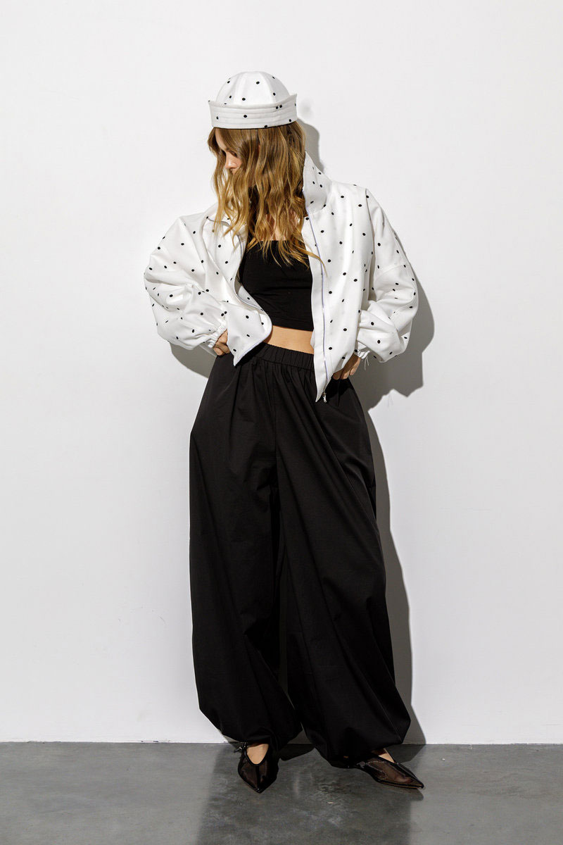 Детали: О-силуэт, расширенные плечи, высокий воротник стойка, пояс и манжеты на резинке, застёжка на молнию, функциональные карманы, куртка на подкладке. Ветровка из текстильной ткани с вышивкой «горошек».