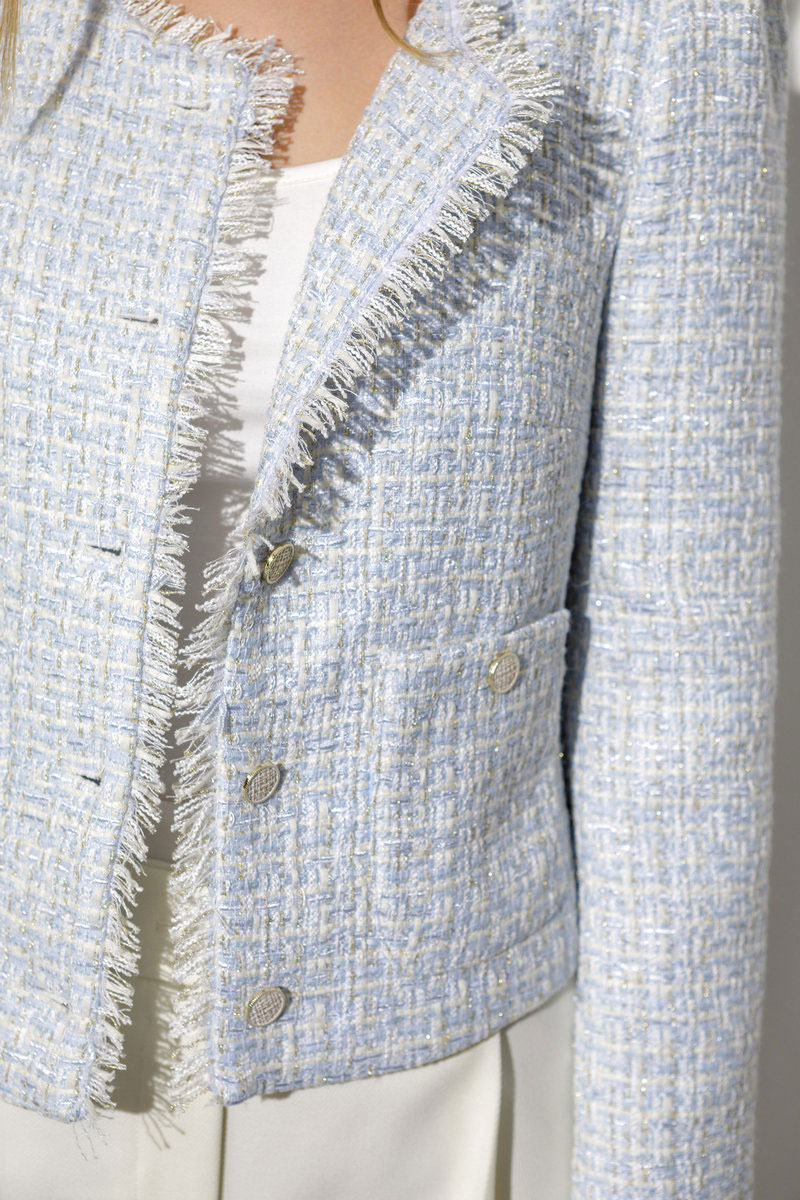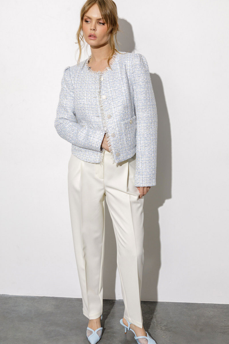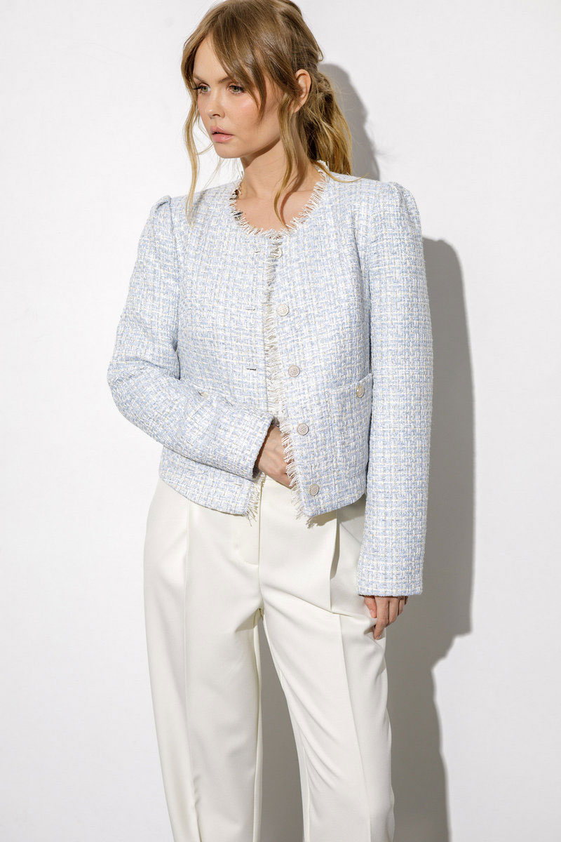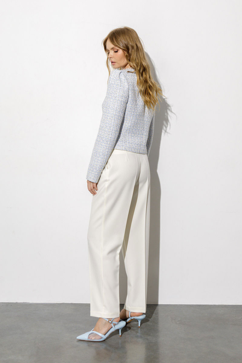 Костюм-двойка из укороченного жакета из твида и укороченных классических брюк со стрелками.