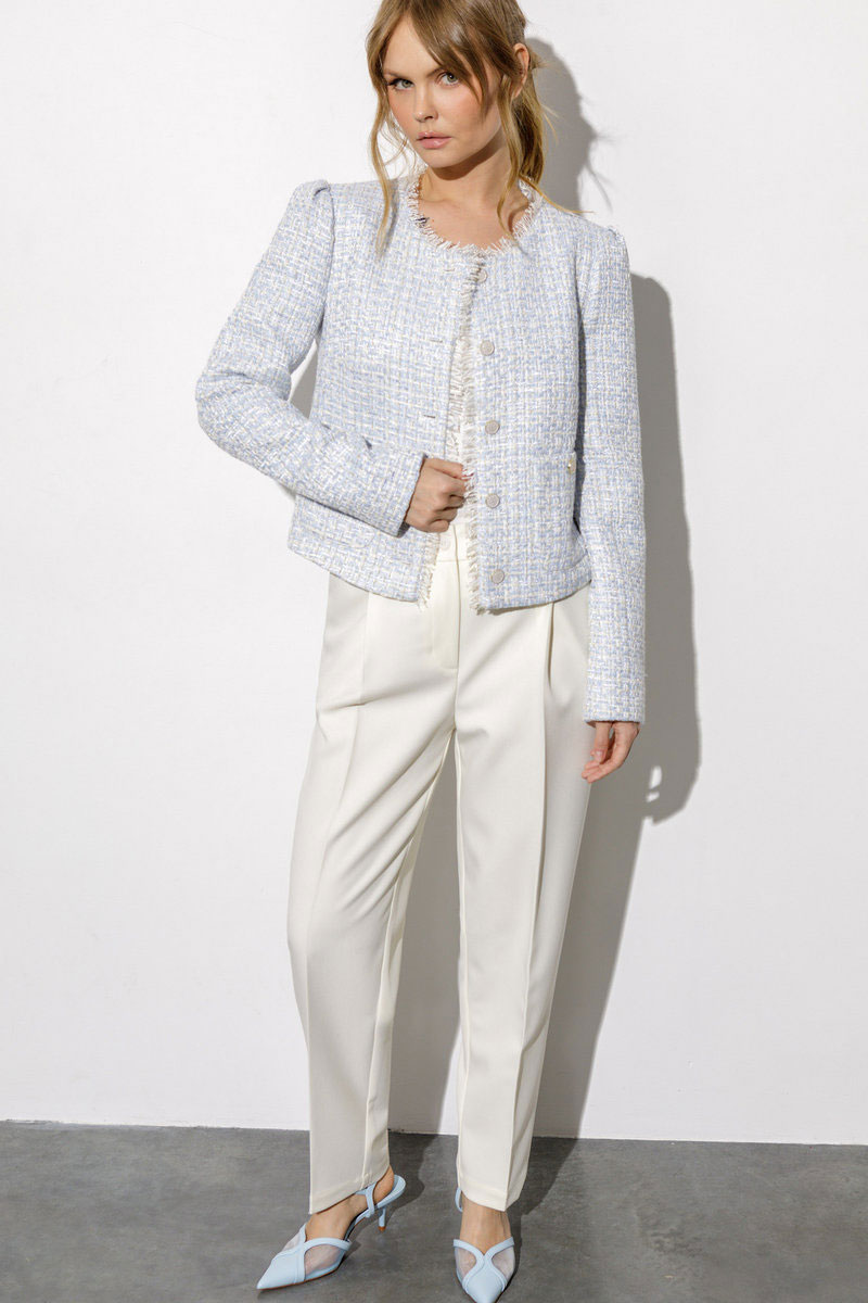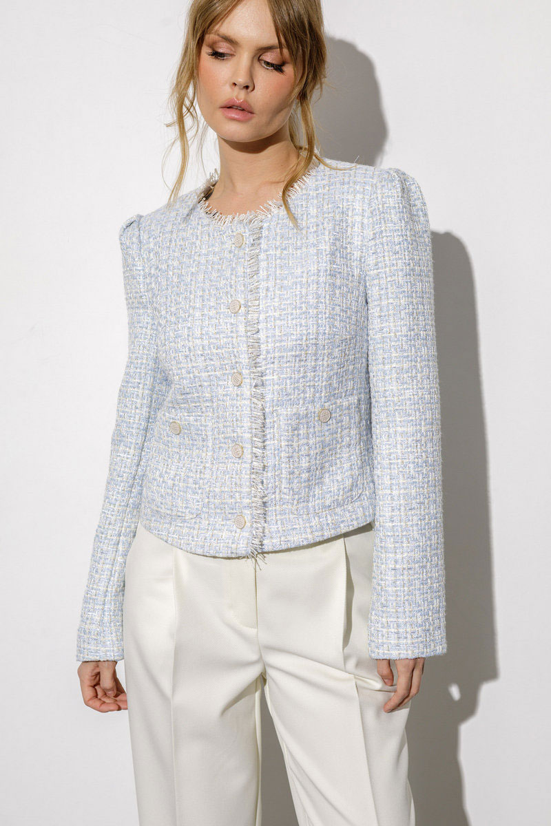 Детали: полуприлегающий силуэт, рельефы, круглая горловина, без воротника, рукава втачные со складками по окату, функциональные карманы, застежка на петли и пуговицы, на подкладке.