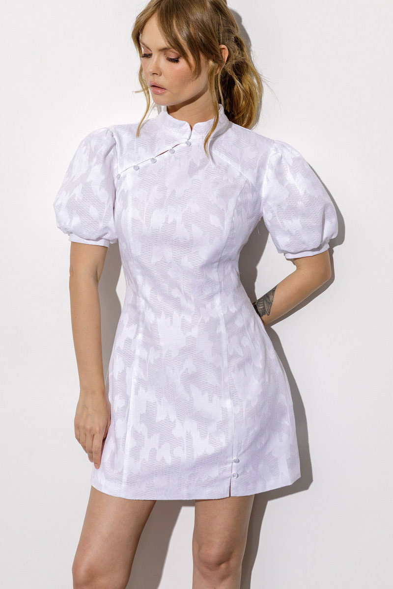 Детали: приталенный силуэт, воротник-стойка с асимметричной застежкой, спинка со средним швом и застежкой на потайную молнию, рукава-фонарики с манжетой и имитацией застежки, платье на хлопковой подкладке.