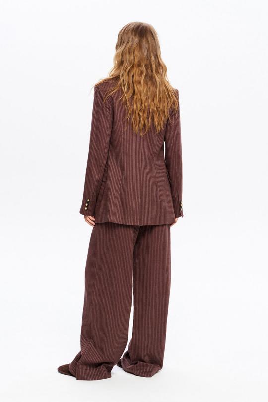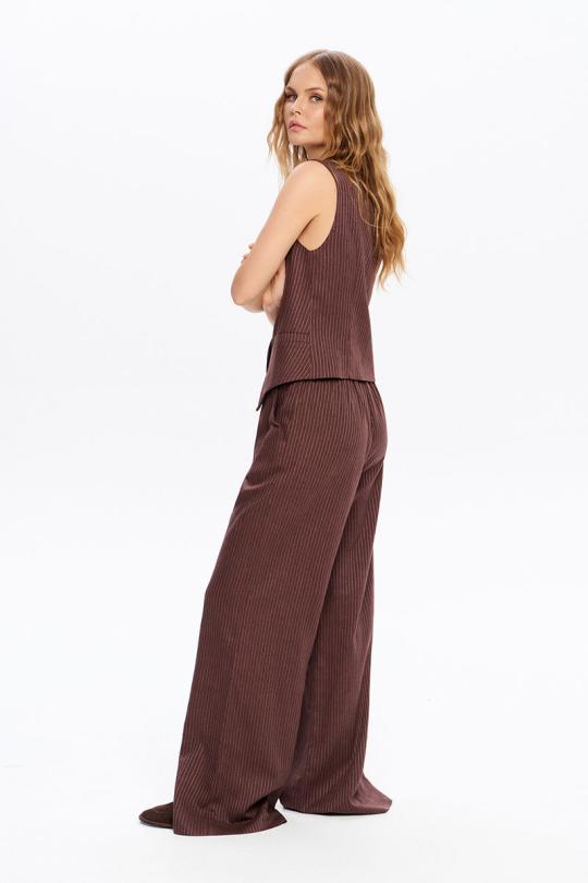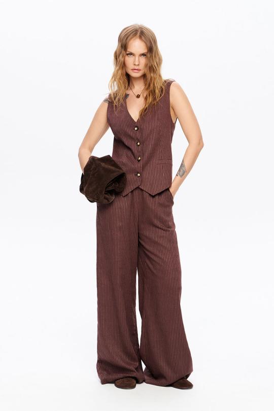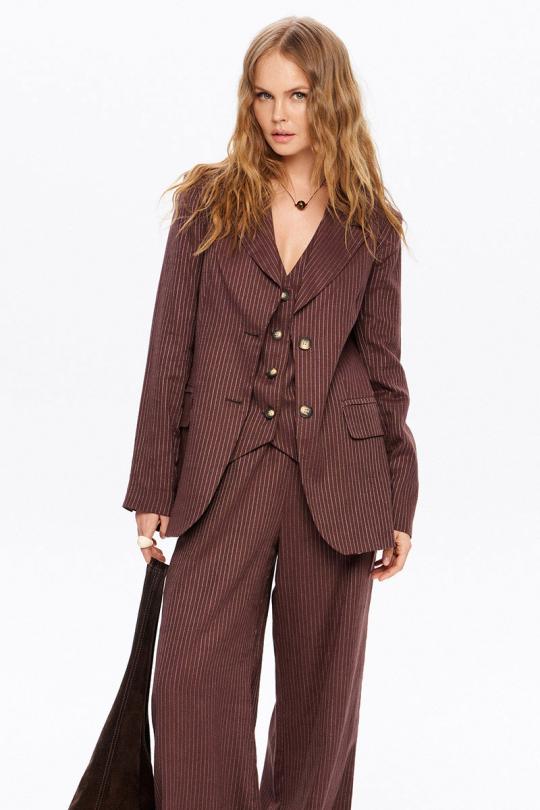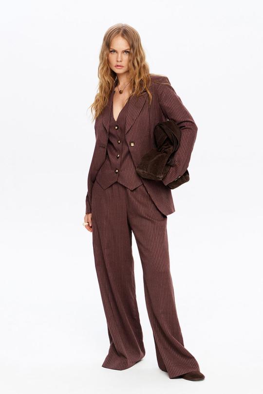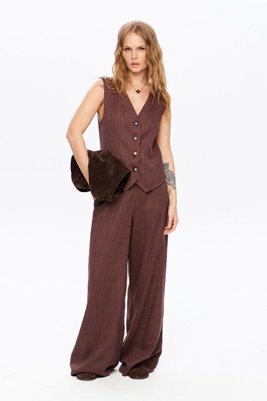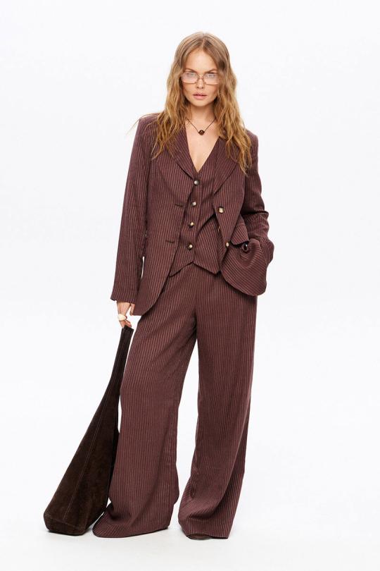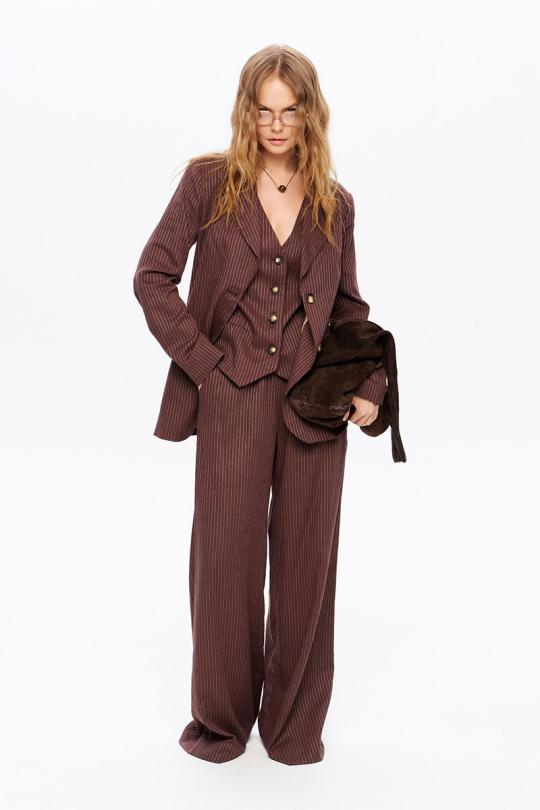 Льняной костюм-тройка из полуприлегающего жакета, укороченного жилета и широких брюк на резинке.