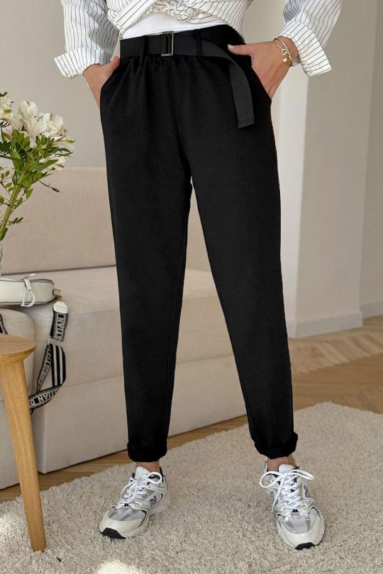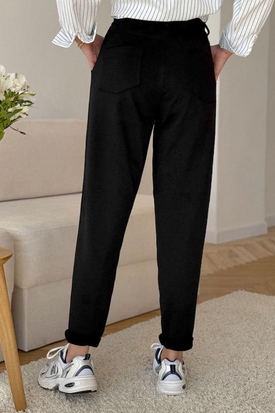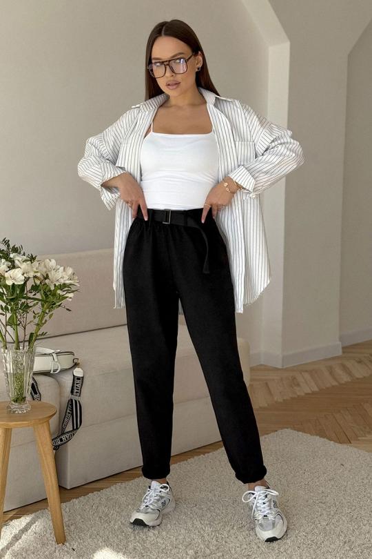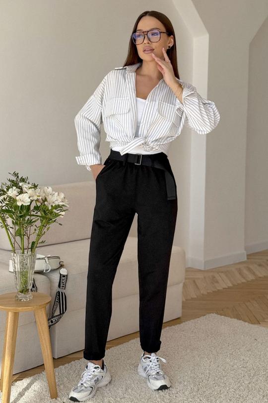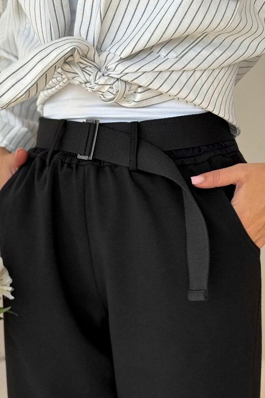 Брюки женские из трикотажной хлопковой ткани (двунитка), слегка заужены к низу. В боковых швах расположены карманы. По низу передних половинок есть защип. Задняя половинка брюк с отрезной кокеткой и накладными карманами. Вверх брюк обработан поясом с резинкой (без молнии). ПОЯС ВХОДИТ В КОМПЛЕКТ.