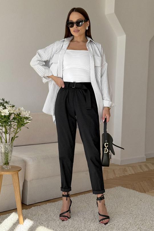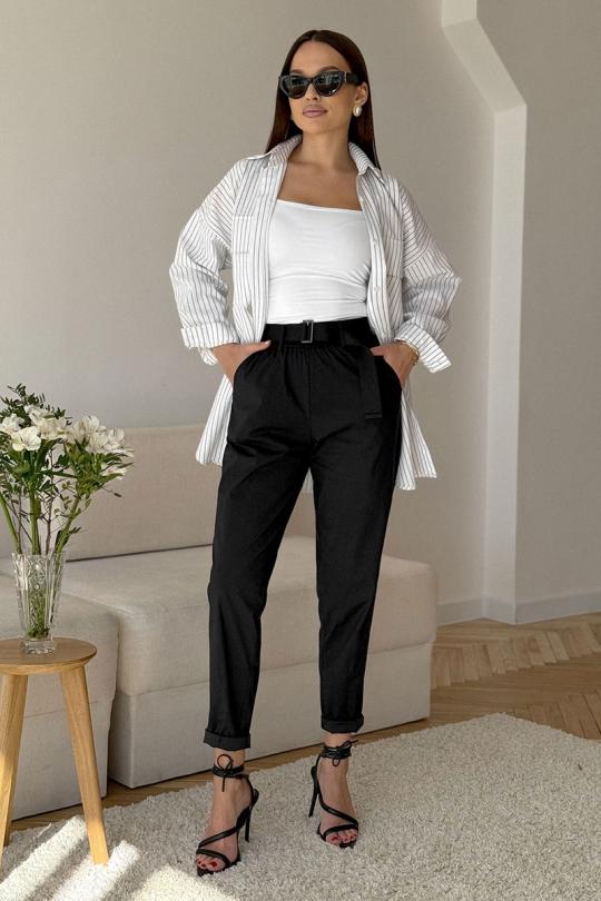 Брюки женские из текстильной ткани, слегка заужены к низу. В боковых швах расположены карманы. По низу передних половинок есть защип. Задняя половинка брюк с отрезной кокеткой и накладными карманами. Вверх брюк обработан поясом с резинкой (без молнии). ПОЯС ВХОДИТ В КОМПЛЕКТ.